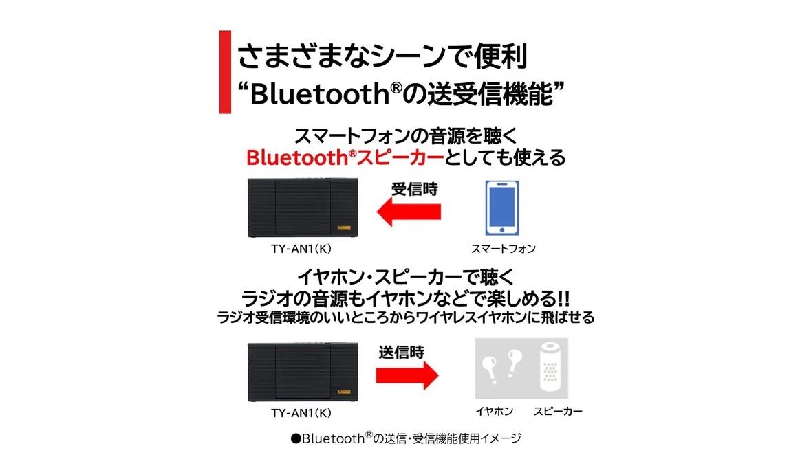 スマートフォンの音源を送信して聴く受信機能だけでなく、TY-AN1で再生した音源をお手持ちのBluetooth®イヤホン・スピーカーへ送信して聴くこともできます。 Bluetooth®送信機能は、ラジオ放送を聴くときにも使えるので、電波の届きにくい室内でAMラジオを聴く場合、受信レベルの良い窓際などにラジオ本体を置いてBluetooth®スピーカーへ送信すれば、室内の好きな場所で雑音の少ないクリアな音のラジオ放送を聞くことができます。