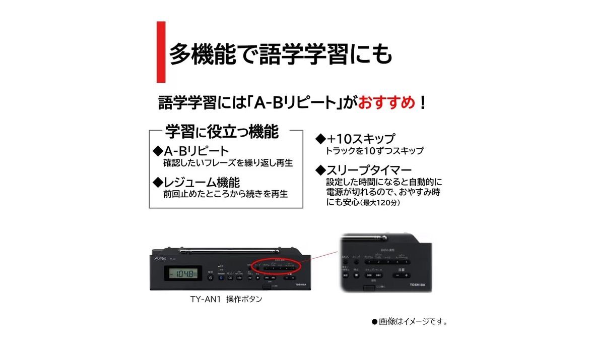 前回止めた続きから再生できる「レジューム機能」を搭載。聴きたい場所をくり返し再生する「A-Bリピート」再生や、英語学習などトラック数が多いCDを聞くときに役立つ、トラックを10個ずつ飛ばせる「+10」スキップ機能をはじめ、「リピート再生」「プログラム再生」「ランダム再生」などいろいろな再生方法でCDを楽しめます。