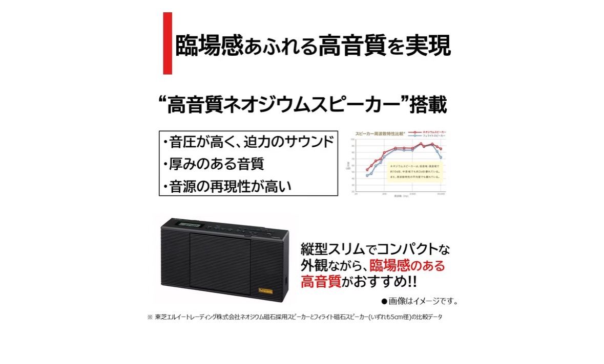 スピーカーの性能を左右する磁石に、フェライト磁石の10倍以上の磁力をもつネオジウム磁石を採用。高能率化とともに、入力信号に対するスピーカーのレスポンスが向上しました。ネオジウムスピーカーは従来のフェライトスピーカーに比べて入力への反応が早く、透明感のある音質となり、原音の再現性が高くなります。また、ネオジウム磁石の採用にあわせ、スピーカー振動板やセンターキャップなどの構造にも変更を加えることで、周波数特性を改善し、厚みのある音質に仕上げました。縦型スリムでコンパクトな外観ながらに、臨場感のある高音質を楽しめます。