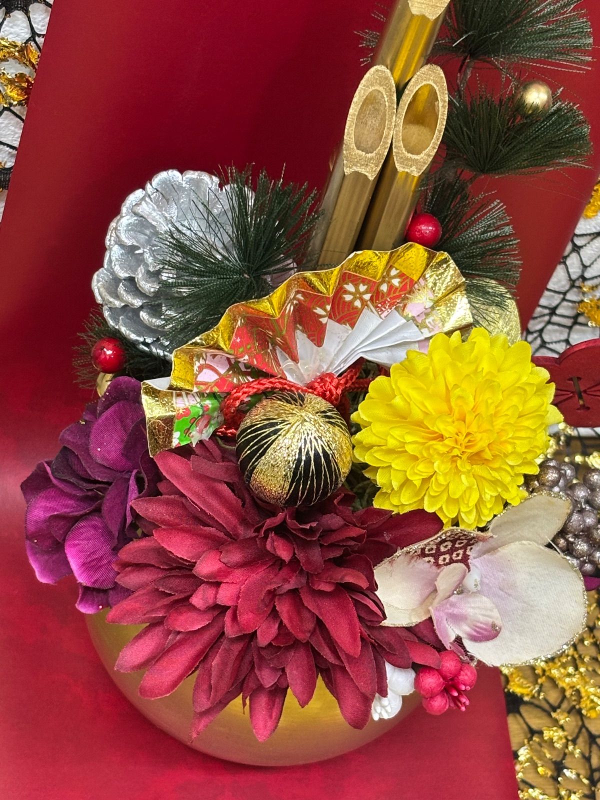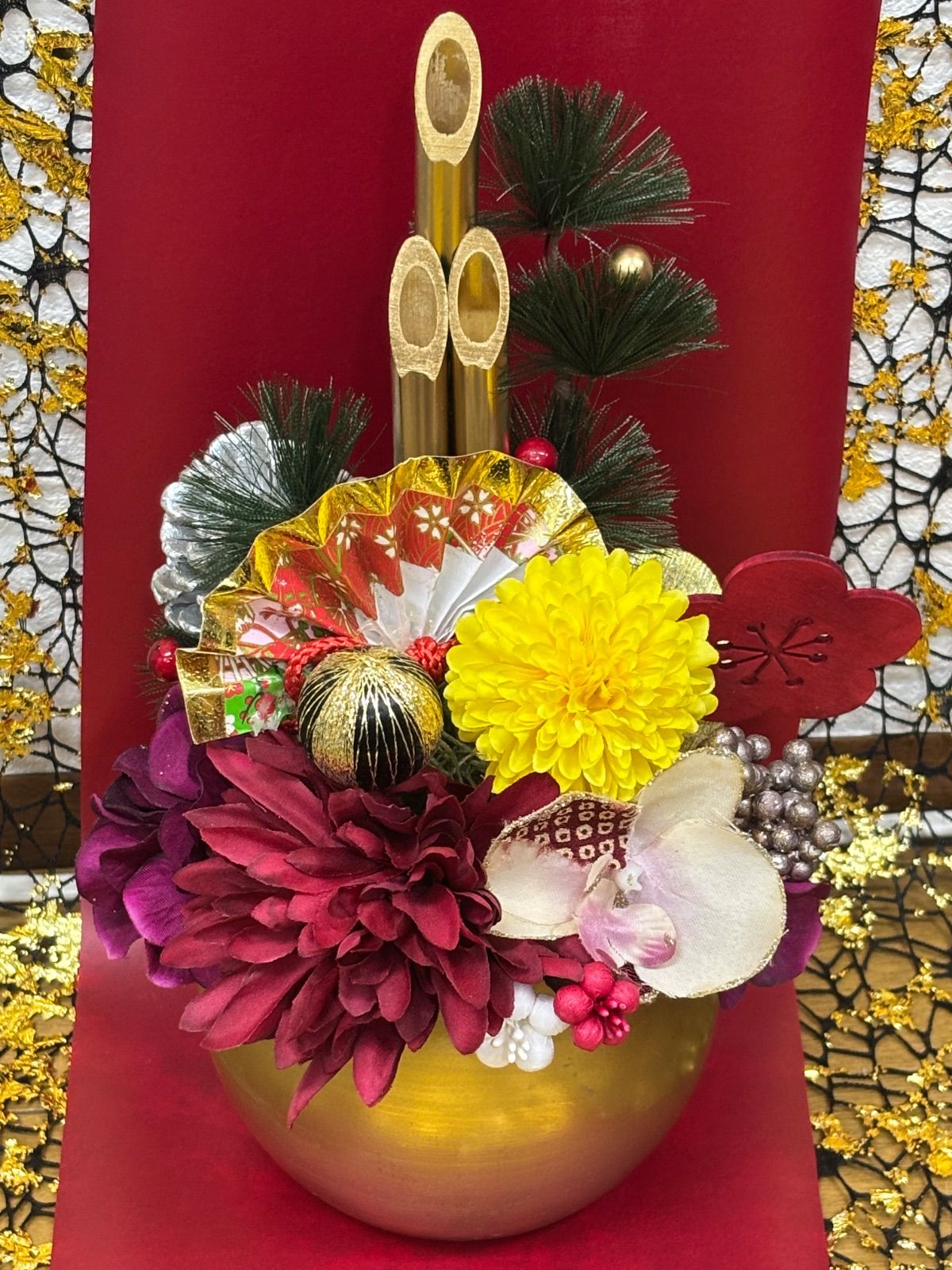 門松 アレンジ 正月飾り 松竹梅 造花 菊 ダリア 金 ゴールド ミニ門松