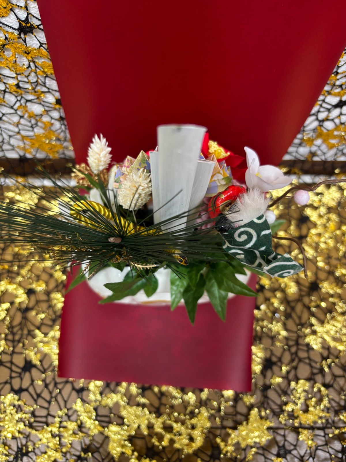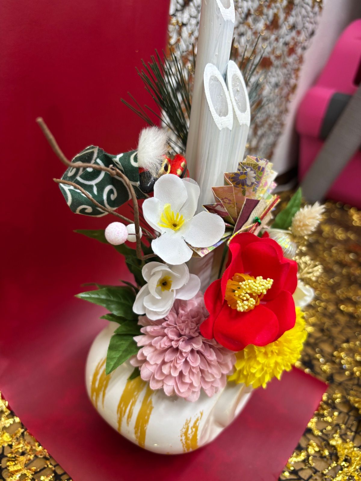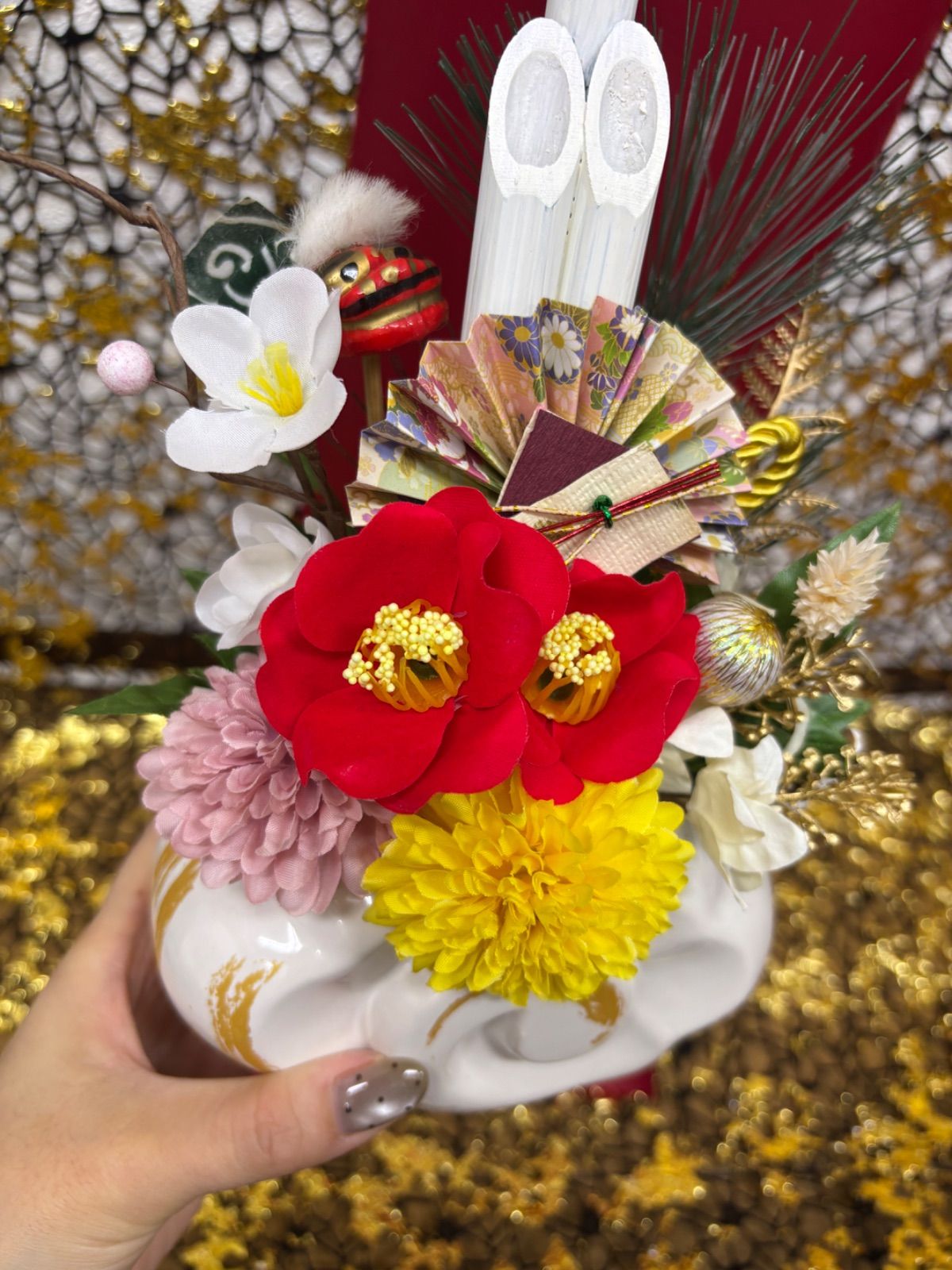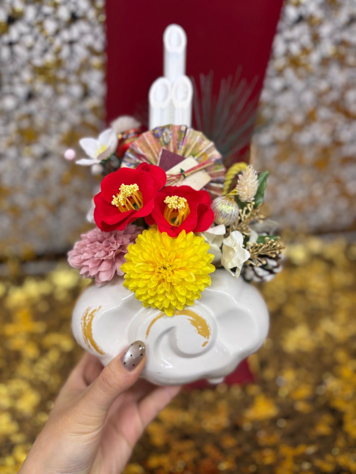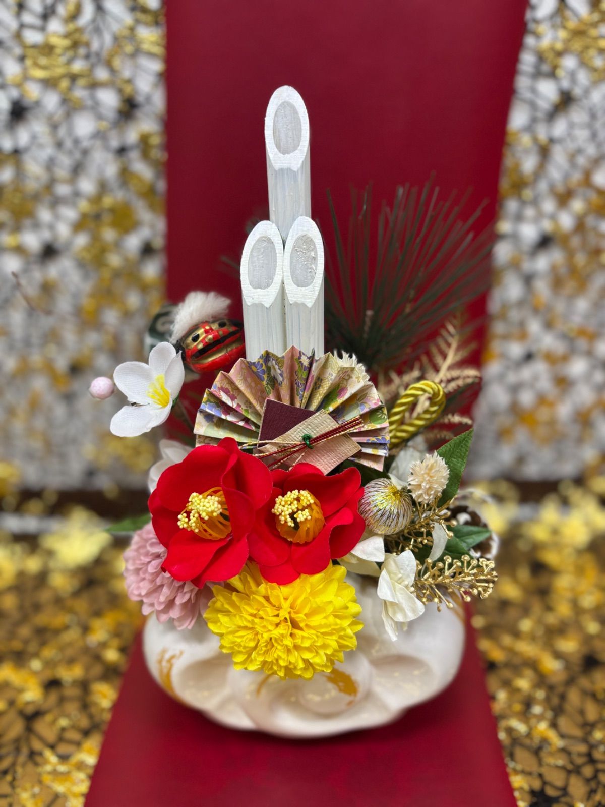 白い竹とちりばめられたピンク色が可愛らしく、ツバキが入ることで和の雰囲気も持ち合わせたモダンなミニ門松アレンジです。