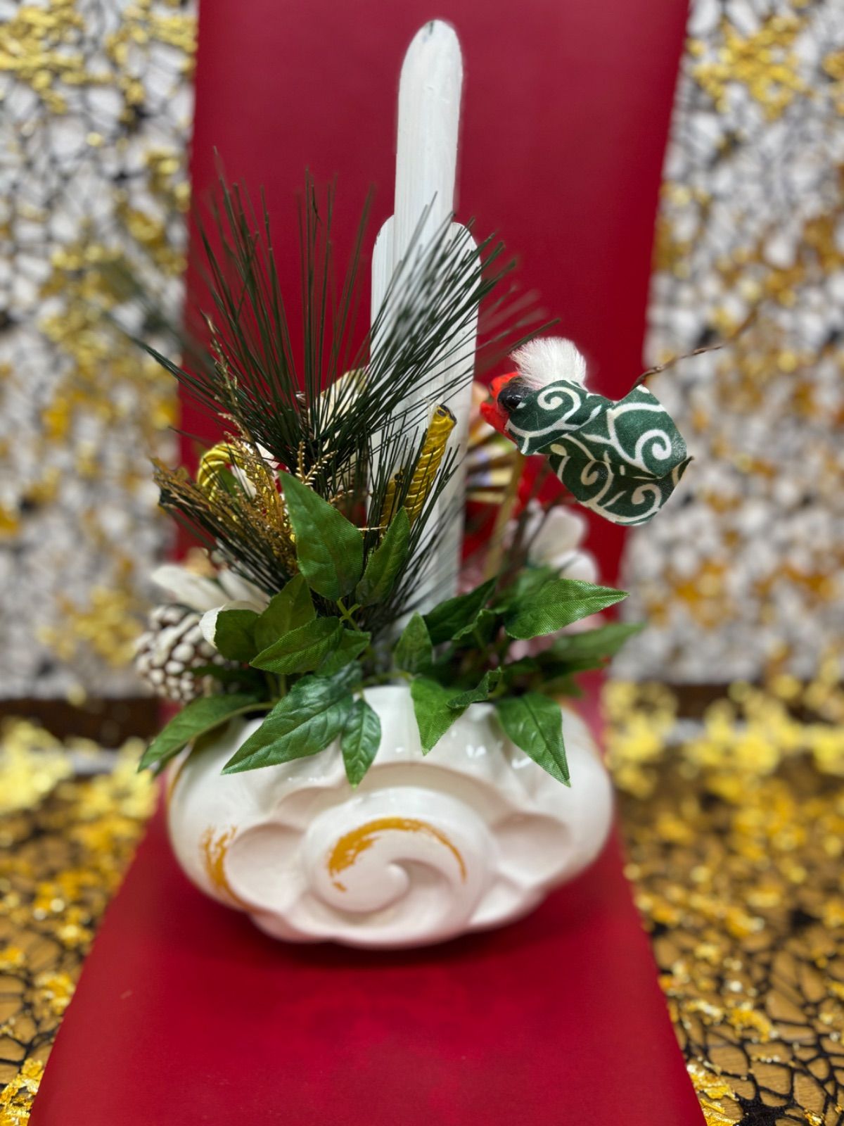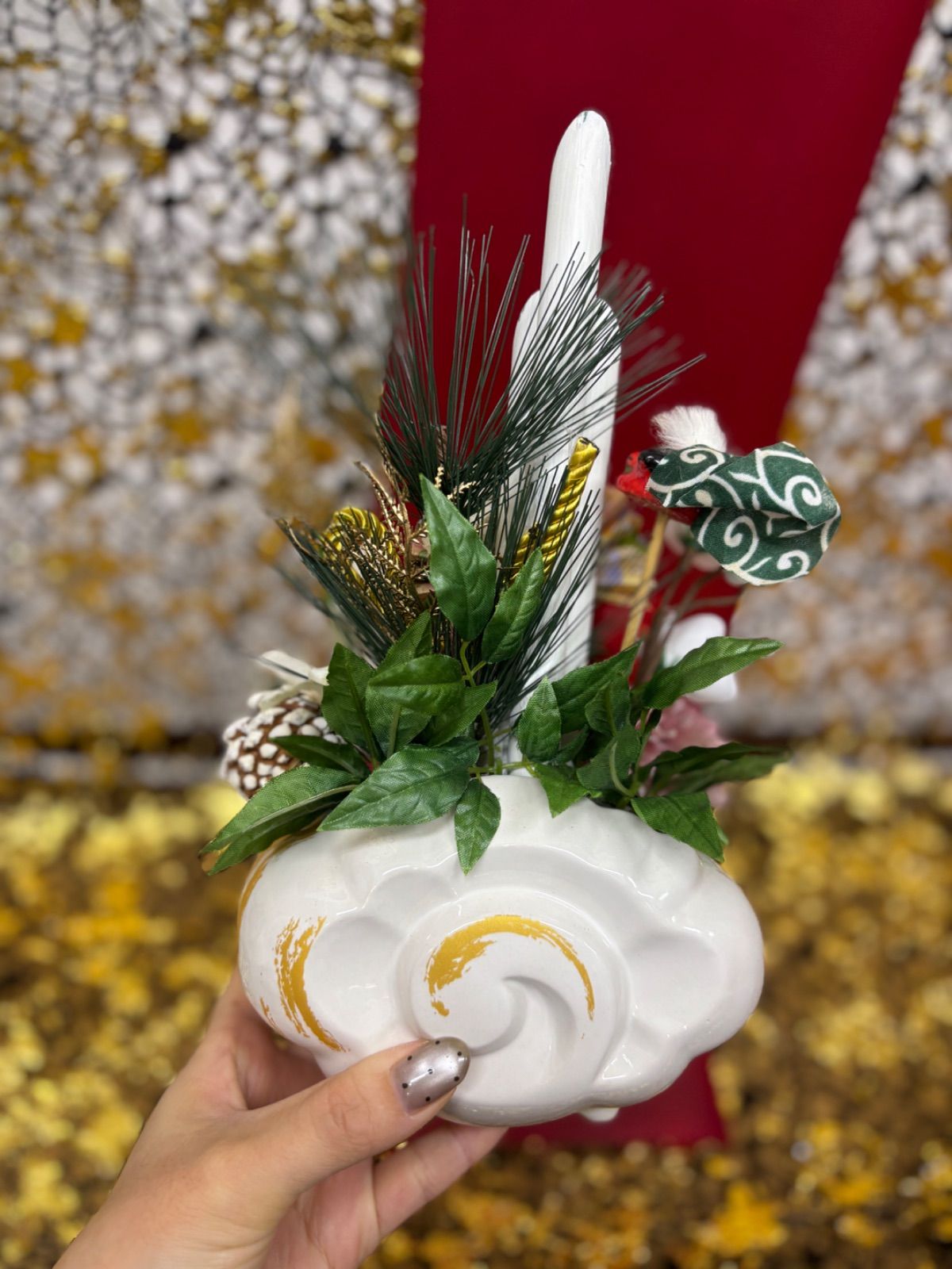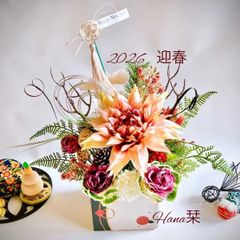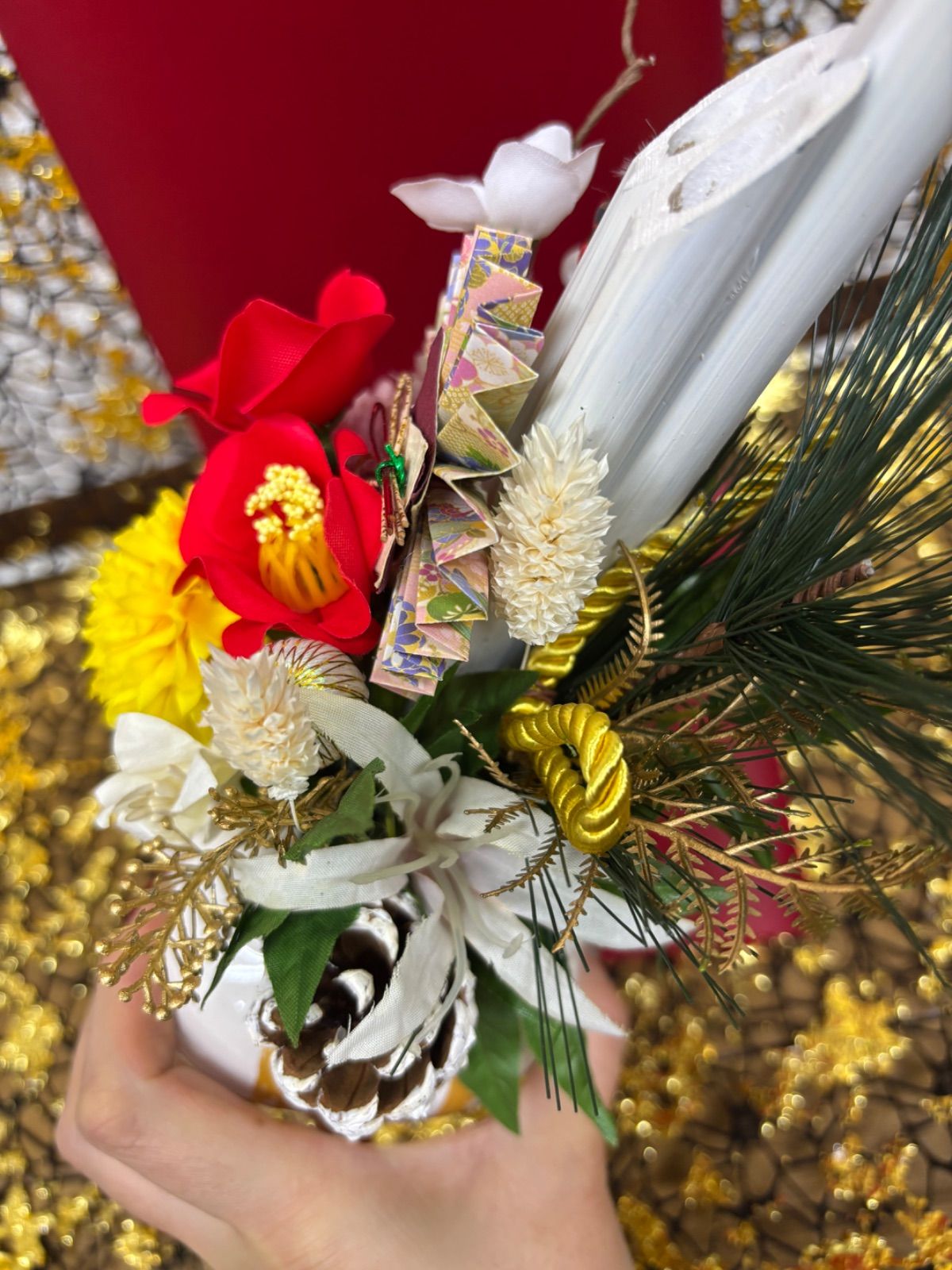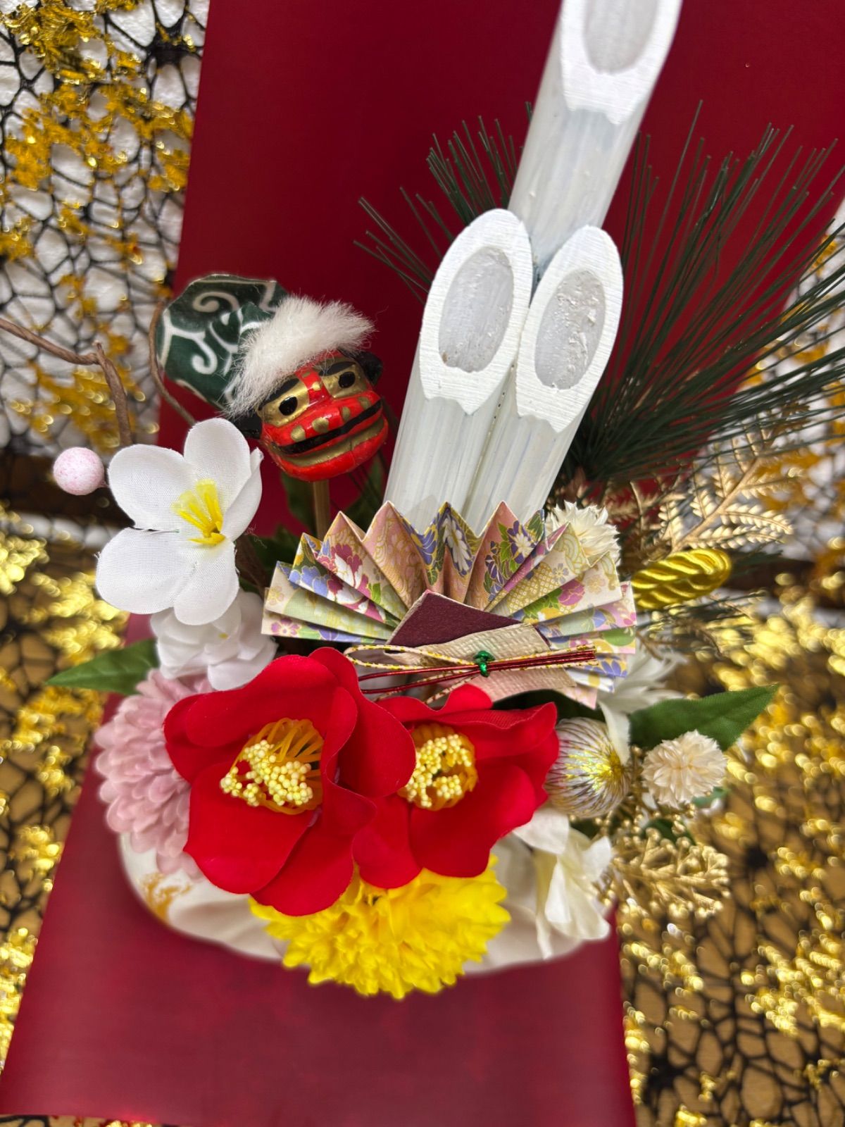 白い竹とちりばめられたピンク色が可愛らしく、ツバキが入ることで和の雰囲気も持ち合わせたモダンなミニ門松アレンジです。