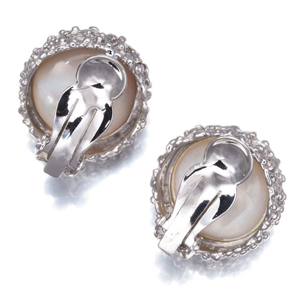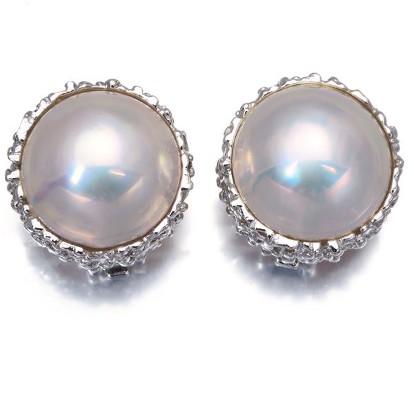 鮮やかなテリと共に虹色の干渉色浮かべるタサキ厳選大粒マベパールの輝きを飾ったイヤリング。台座には高さを持たせ繊細なデザインを演出しております。