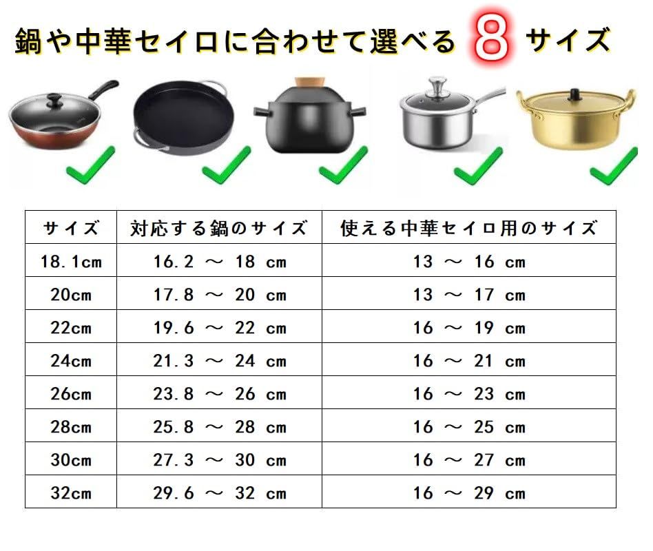 【中華セイロ用受け台 - サイズ】小さめの18cm~サイズの32cmまで対応しているので、使いたいせいろの大きさと家にある鍋の大きさなどを参考にしながら、ぴったりなサイズの蒸し板をお選びください。