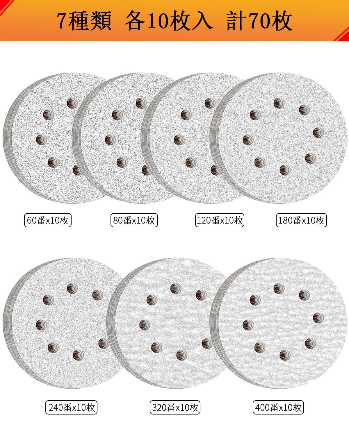 【セット内容】:70枚サンディングディスクセット、粗目から細目まで7種類各10枚---コストパフォーマンスの高い製品,そのほとんどをねの研磨要件を満たすのに十分,#60-#120粗いメッシュ, 製品の粗研削、バリ取り用です,#180-#240中メッシュ、製品の中程度の研削、プライマーサンディングに使用します,#320-#400ファインメッシュ,製品の微粉砕、上塗りサンディング用