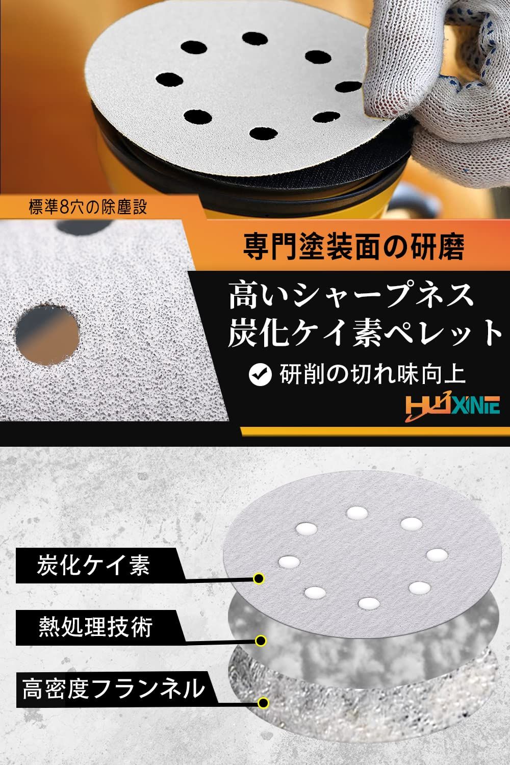 【ドライサンディングディスク】:炭化ケイ素ドライサンディングディスクは円形直径125mm、8穴を持ち、加工砂の表面には白色のスーパーコーティングが施されており、砂の表面にホコリや塗料のべたつきを防ぎ目詰まりを防ぎ、帯電防止効果がありますそして優れた柔軟性