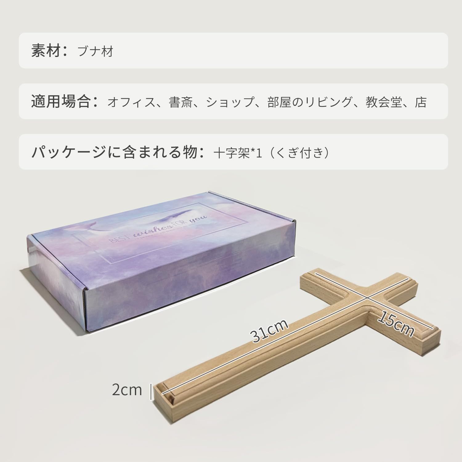 ?製品名前:壁掛け装飾用十字架。?素材:ブナ材。?サイズ:31*15*2cm。?スタイル:木色。?パッケージに含まれる物:十字架*1(くぎ付き)。