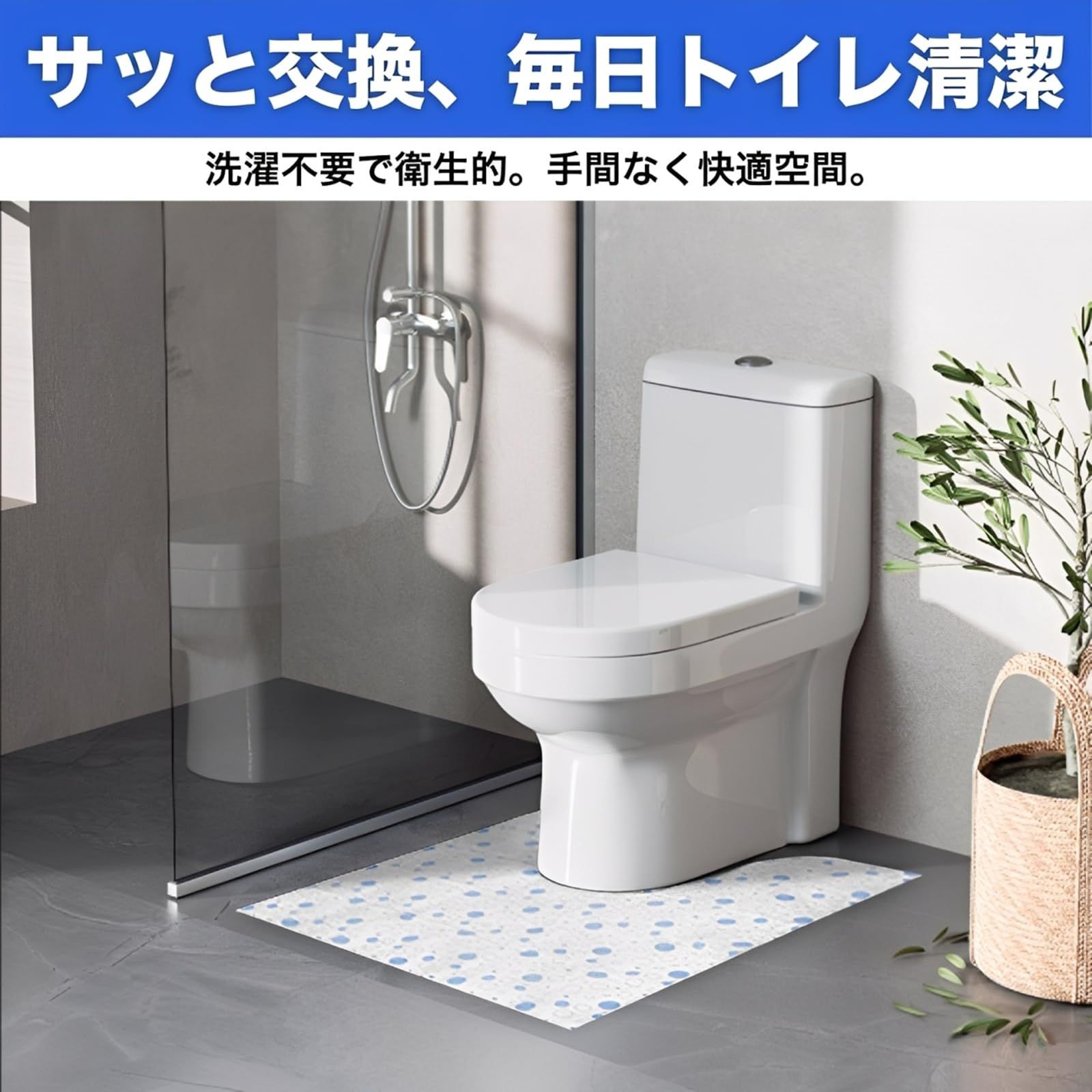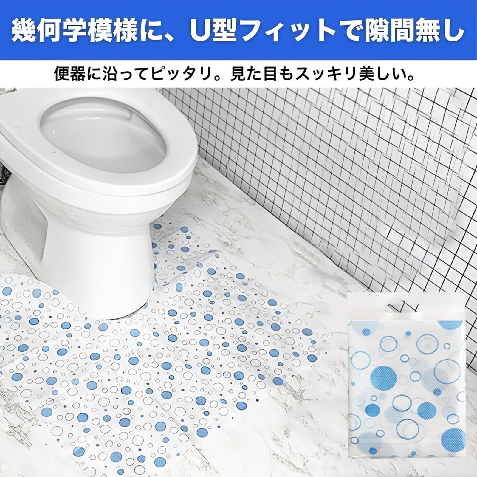 個包装」は、お風呂場やトイレの便器の足元に敷く、防水性と滑り止め機能を備えた使い捨てのトイレ床シートです。形状は便器の足元にフィットしやすいU字型になっています。✅汚れたらすぐに新しいものに交換できるため、常に清潔な状態を保てます。布製のマットのように洗濯したり、乾燥させたりする手間は一切不要。忙しい毎日を送るあなたにぴったりの衛生管理ソリューションです。✅表面は不織布、裏面はPEフィルムで加工されており、水や汚れをしっかりガード。さらに、トイレ床シートは滑り止め加工が施されているため、濡れた床でもご使用いただけます。お子様やご高齢の方がいるご家庭でも、転倒のリスクも軽減!✅マットの裏面には滑り止めテープ付きで、床にしっかりと貼り付けることができます。これにより、使用中にマットがズレる心配はありません。剥がす際も、床に跡が残りにくいように工夫されています。✅【商品仕様】サイズ1枚