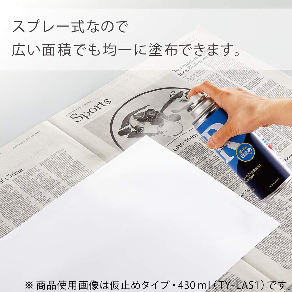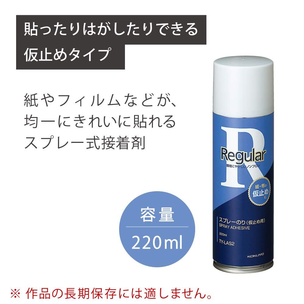 ※作品の長期保存には適しません。 「主な仕様」貼ったりはがしたりできる仮止めタイプのスプレー式接着剤です。広い面積の紙やフィルムなどの仮止めに。