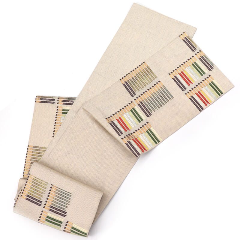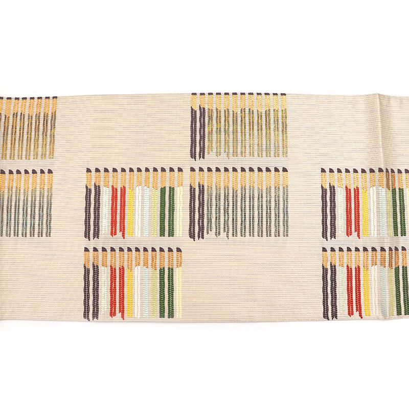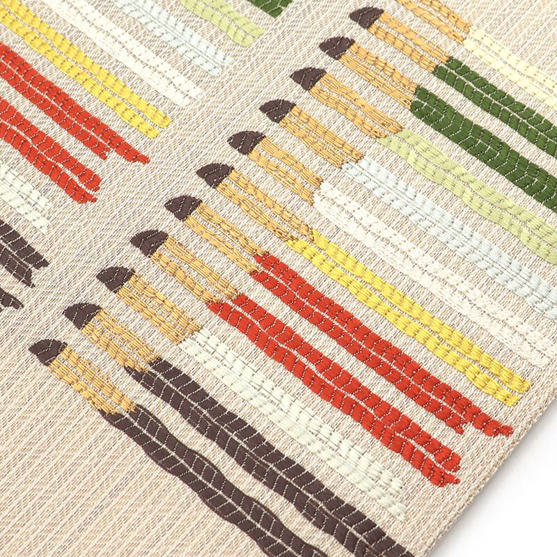 地柄のある白ベージュの地に、 芥子色や赤、深緑、深紫などの色合いで、 抽象的な柄取りが素敵な袋帯です。 柔らかな地色に、和の色で表現された抽象柄が素敵です。おしゃれ感と上品さがある優しい袋帯です。