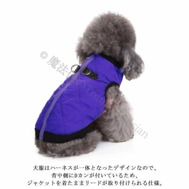 犬服はハーネスが一体となったデザインなので、背中側にDカンが付いているため、ジャケットを着たままリードが取り付けられる仕様。