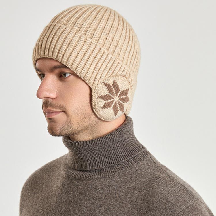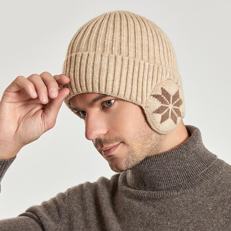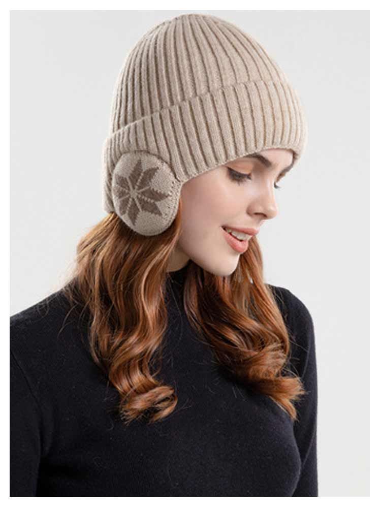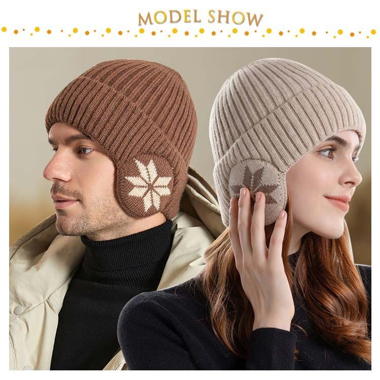 シンプルなリープ編みのハンドメイドの耳あてのついたニット帽子。