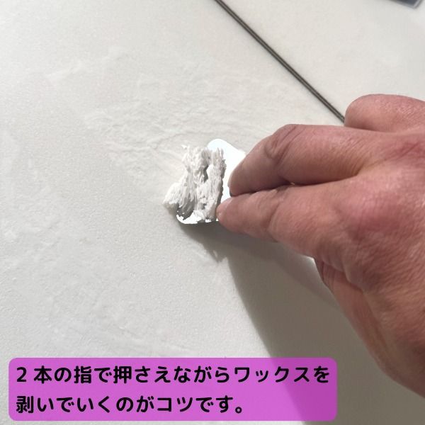 画像ように人差し指と中指でスクレイパーの刃の部分を押さえて少し刃をしならせるように押し出すと凹凸に入り込んだワックスも面白いように綺麗に落とせます。