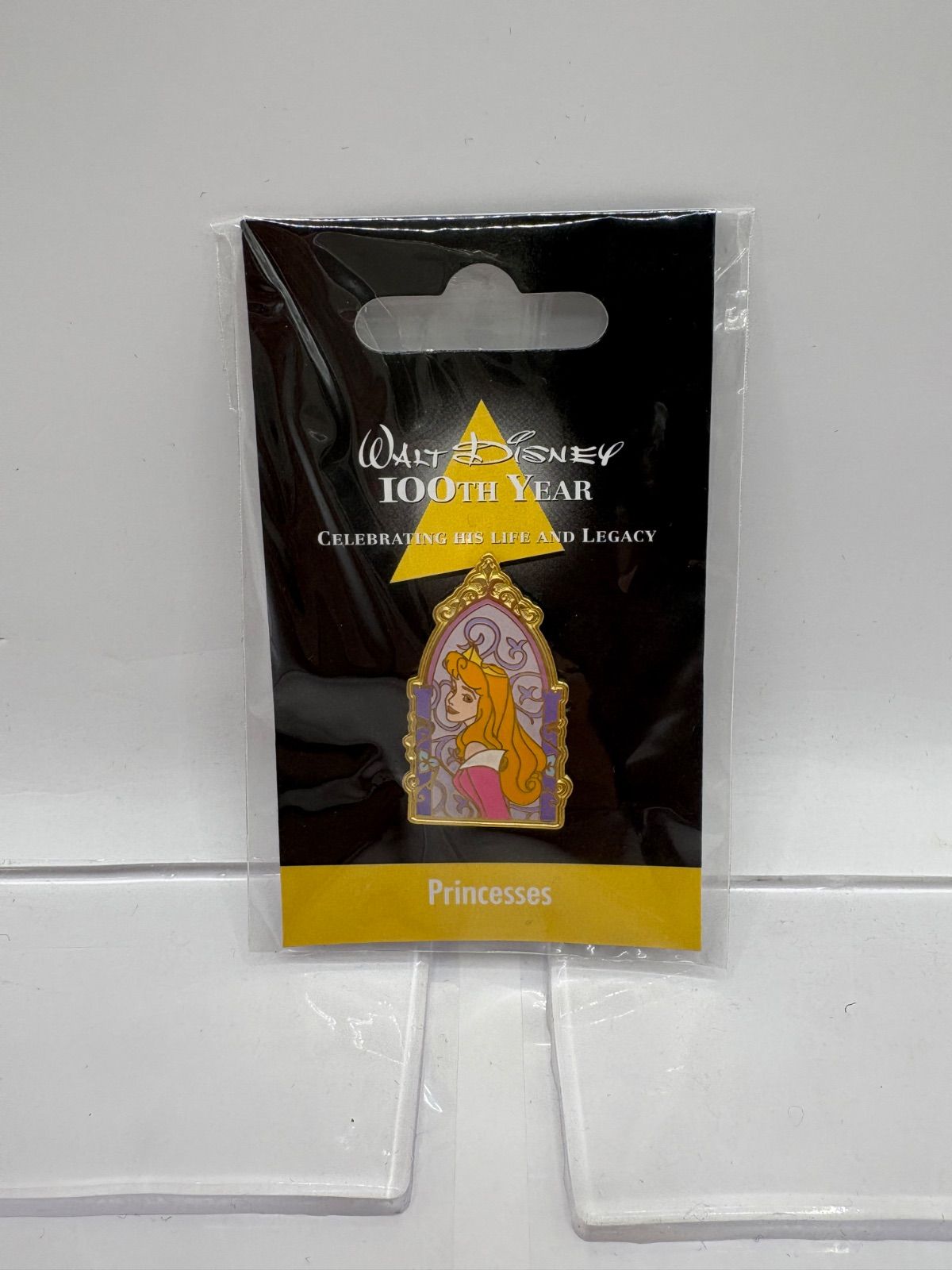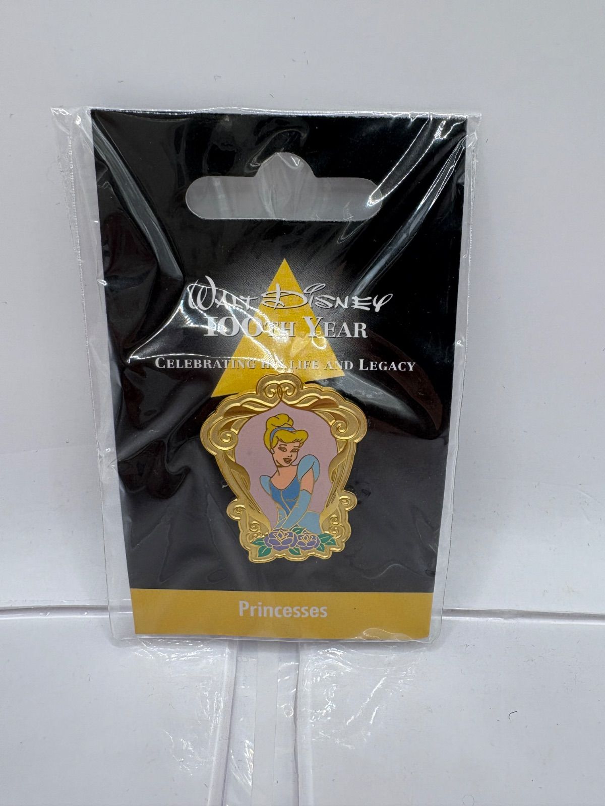 Disney 100th Yearシリーズのプリンセスピンバッジ、「シンデレラ」「オーロラ姫」「白雪姫」の3点セットです。