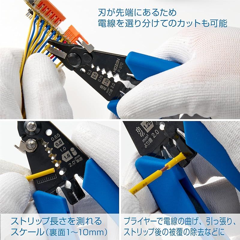 裏面には1mm単位のスケールをマーキング。ストリップ長の測定ができます。また、電線の曲げや引っ張り、被覆の除去に便利なプライヤー、収納時にも安心のストッパー付きです。