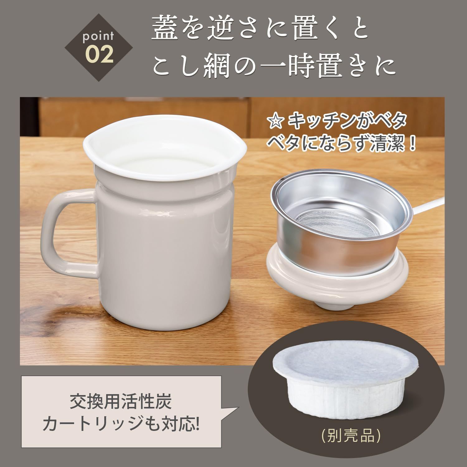 【ご使用上の注意】本品はカートリッジ不要のエコタイプです。 油をポットへ移す際は、調理後1015分ほど冷ました150℃以下の温度が理想的です。 こし網より上に油を注がないようご注意ください。 ホーローはガラス質のため、落下などによる衝撃を避けてください。 取っ手付け根の穴は製造工程上の仕様であり、不良ではありません。 本体・こし網を直接火にかけたり、火気の近くで保管しないでください。