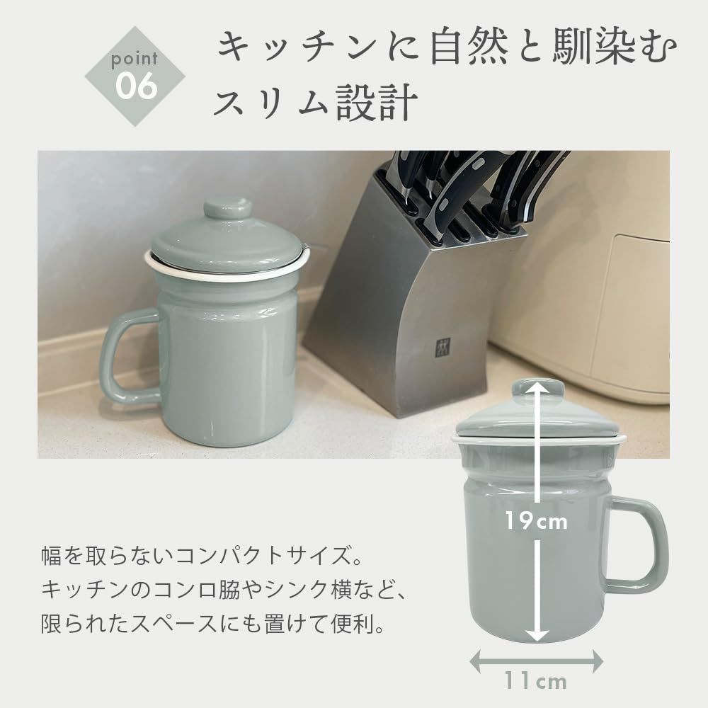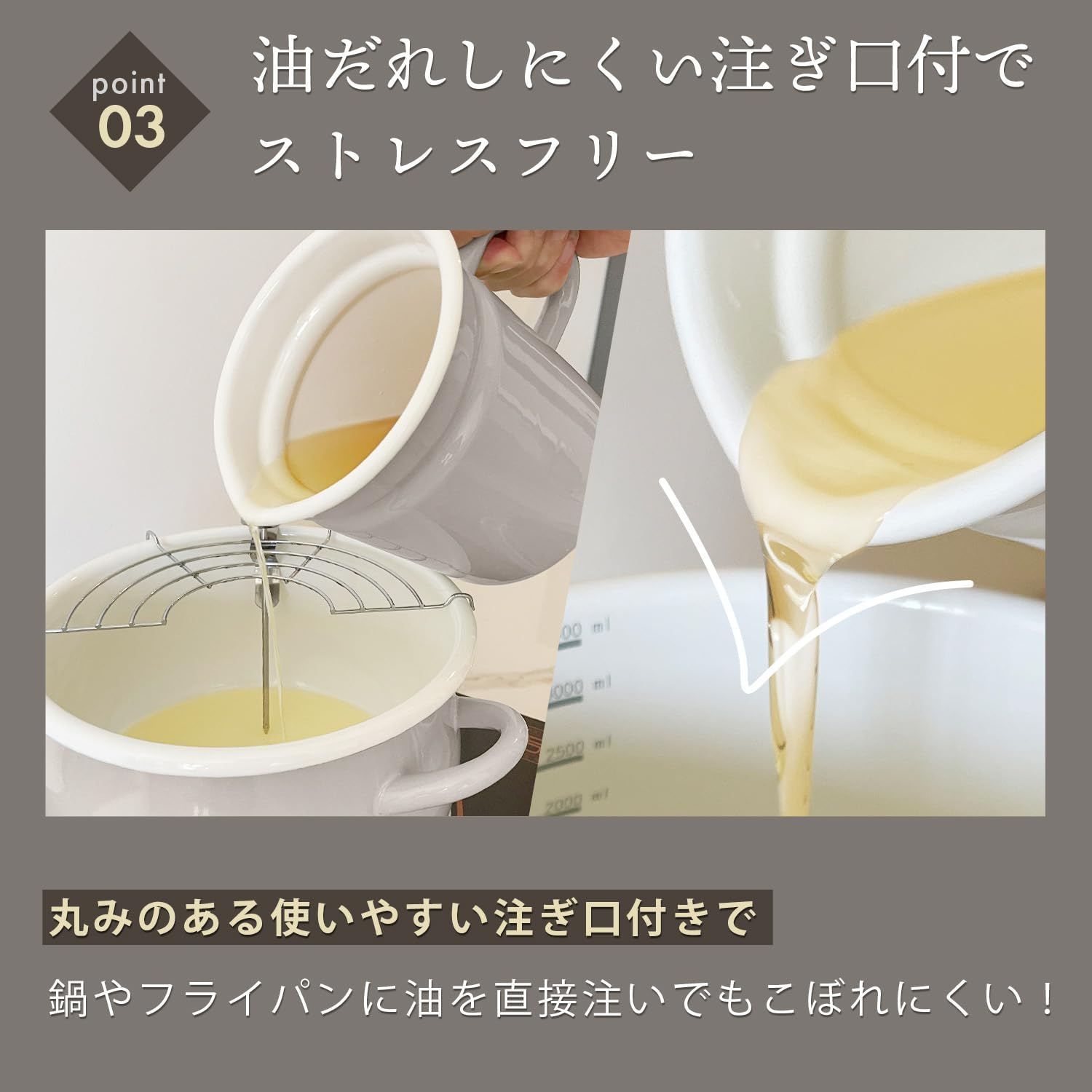 【毎日のお料理に欠かせない】ホーロー×ステンレスの二重こし網付きオイルポットが、キッチンにおしゃれと実用性をプラスします。 ホーロー製の本体は、油の酸化を防ぎ、匂い移りも少なく清潔に保管可能。 ステンレス製の二重こし網で、揚げカスをしっかりキャッチし、油の再利用をもっと簡単に。