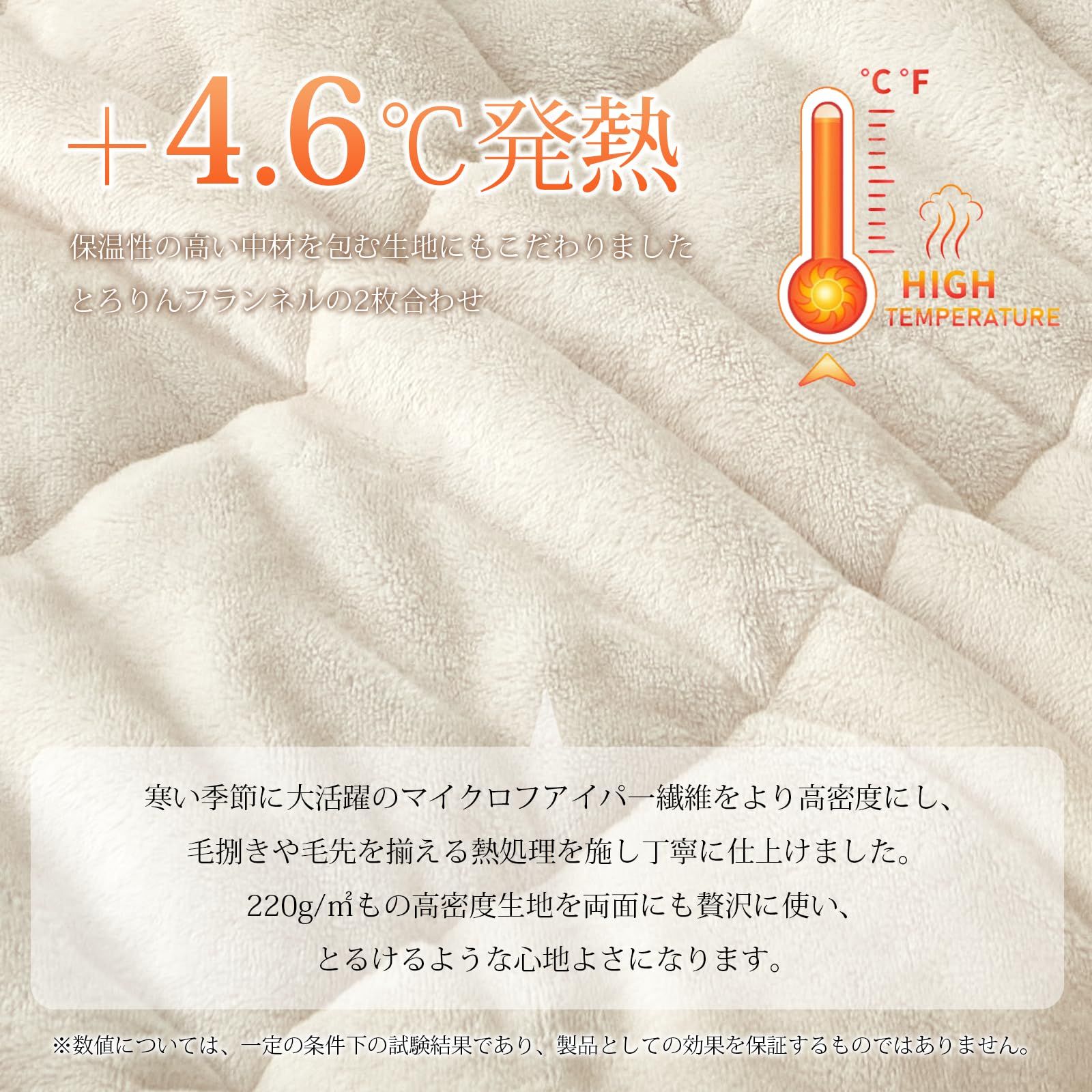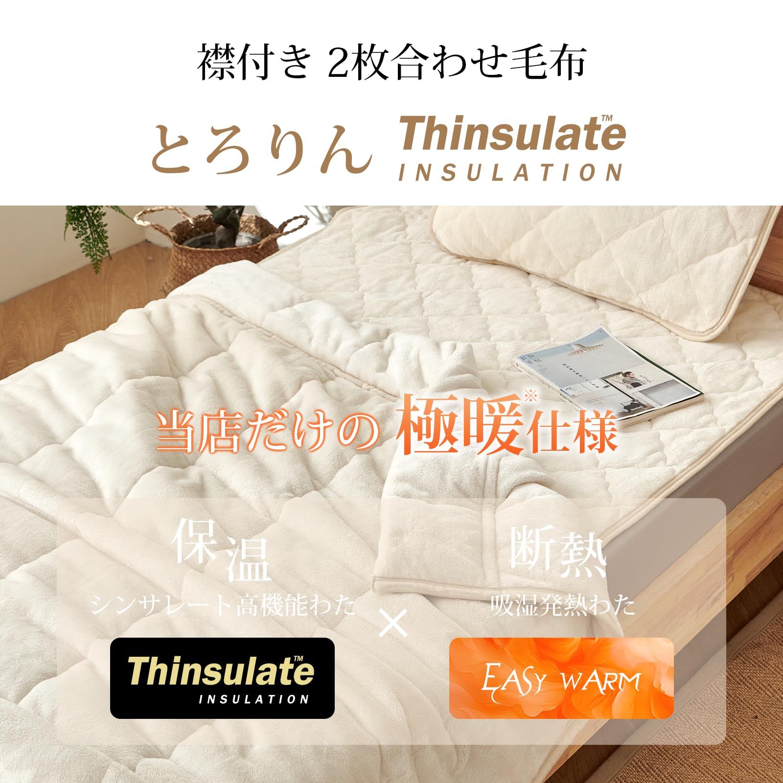 【4層構造で保温力倍増!】上層と下層はなめらかな肌触りのフランネル毛布で、その間にシンサレート綿と吸湿発熱中綿を挟んでいる。2枚合わせのサンドイッチ構造だから優れた断熱効果があり、保温性もより良い。保温力たっぷりの冬用毛布!