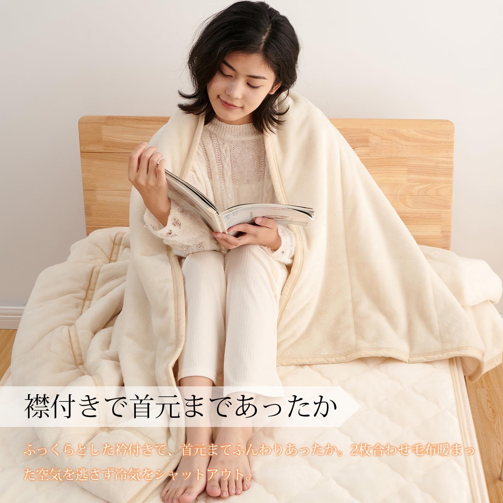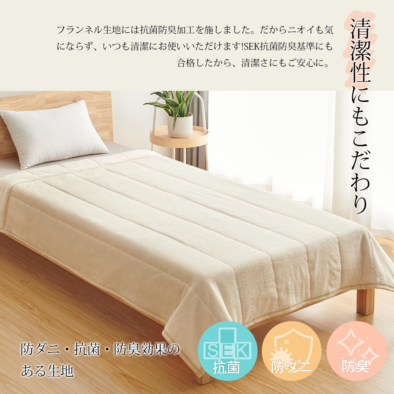 【静電気防止・毛布】 静電気防止の加工を施しているので、空気が乾燥している秋冬にも、安心にお使いいただく。また、二重に縫製しているキルトがはずれにくく、何度洗濯しても型崩れしない。