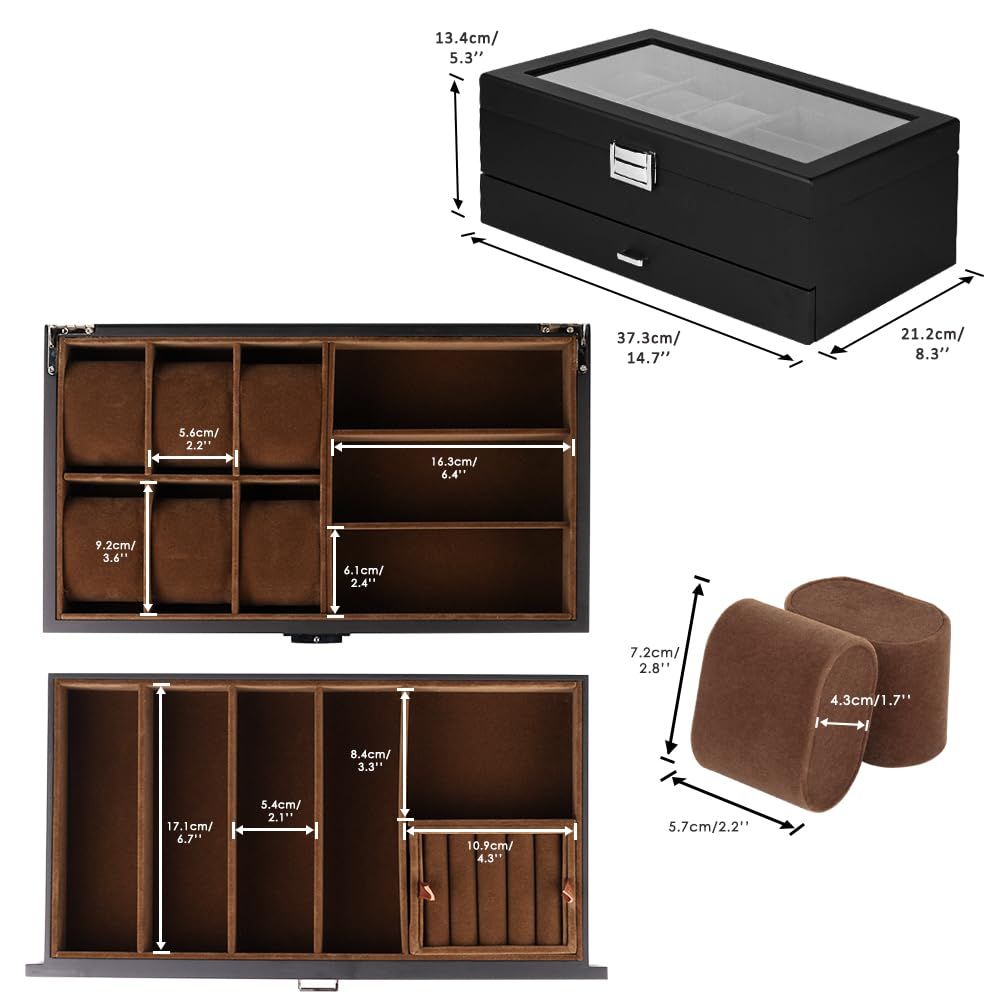 Baskiss 高級2層木製時計ケース 腕時計・眼鏡・ジュエリー収納ボックス 腕時計6本 サングラス7本 アクセサリー・指輪・ブレスレット収納可能 コレクションケース (腕時計6本・メガネ7本)
