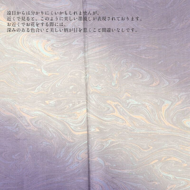 お着物は、品の良い紫色の染め紬の付下げ。遠目からはぼかしの柄に見えますが、墨流しの柄の染紬となります。品格漂う薄紫と、白や濃い紫で濃淡の裾柄が、品格のある着こなしにピッタリな雰囲気。袋帯は、落ち着きのある灰緑、灰青、灰赤、金茶色を用いた菱が連なるような柄取りの袋帯。金糸で、部分的に丁子や祇園守り、花輪違いなどの宝尽くし文も表現されており、おしゃれ感の中に、品格のある雰囲気も織り込まれております。色数もシックな色がメインですが、多めの少しおしゃれ感のある雰囲気が魅力です。
