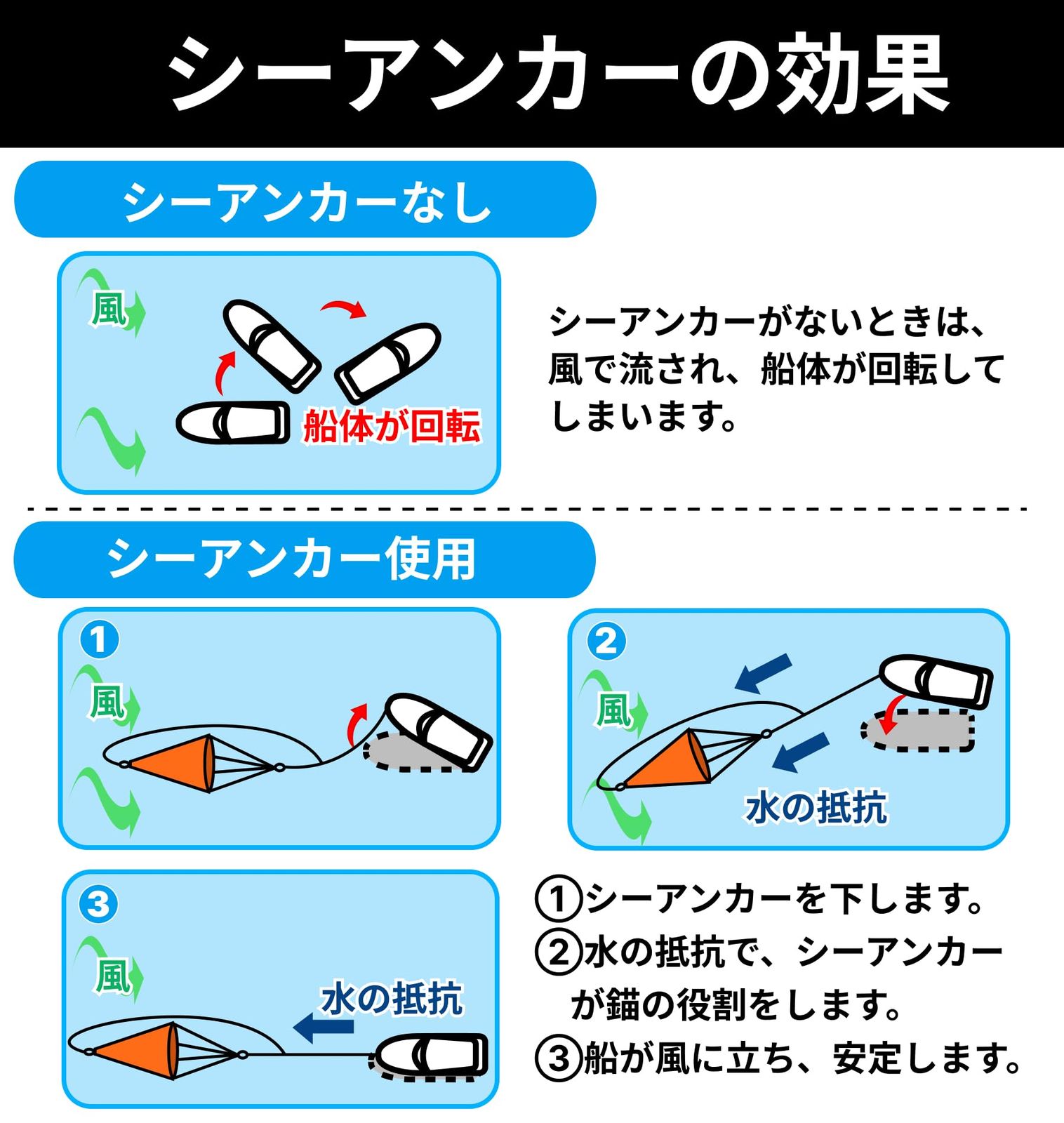 1パラシュートアンカーは、横風でボートが流されそうになったとき、海流を捉えることでボートを安定化させます。海流によって船体が大きく流されてしまうと不安になるかもしれませんが、パラシュートアンカーが捉える海流は、表面の海流よりも比較的穏やかなため、表面の海流ほどには流れません。