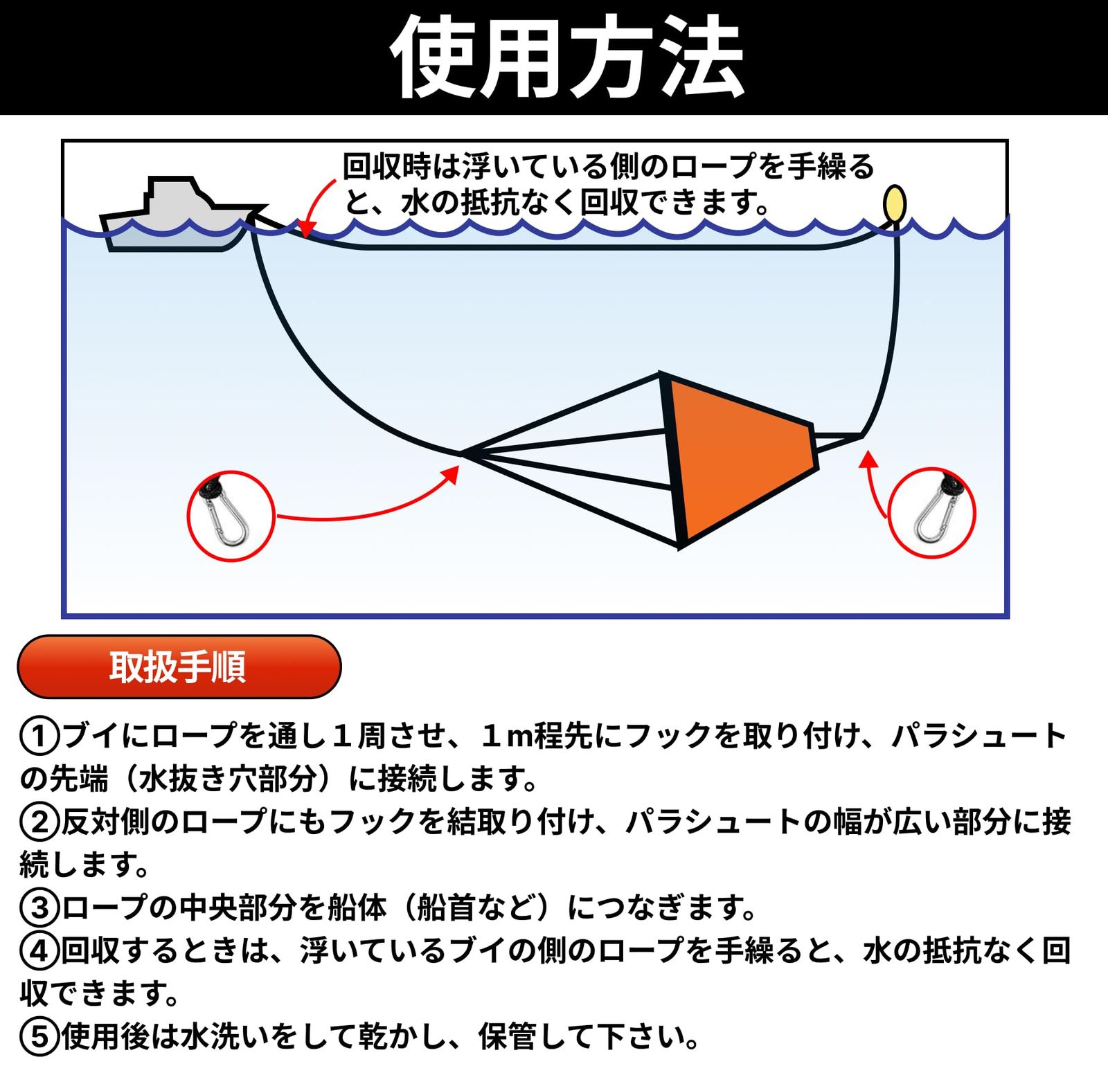 3利用後、パラシュートアンカーは水洗いをして、干して十分に乾かして下さい。パラシュートアンカーには折り目がありますので、コンパクトにたたむことが出来ます。ブイのサイズも大きくないので、パラシュートアンカーおよびロープもまとめて収納できます。【使用方法】