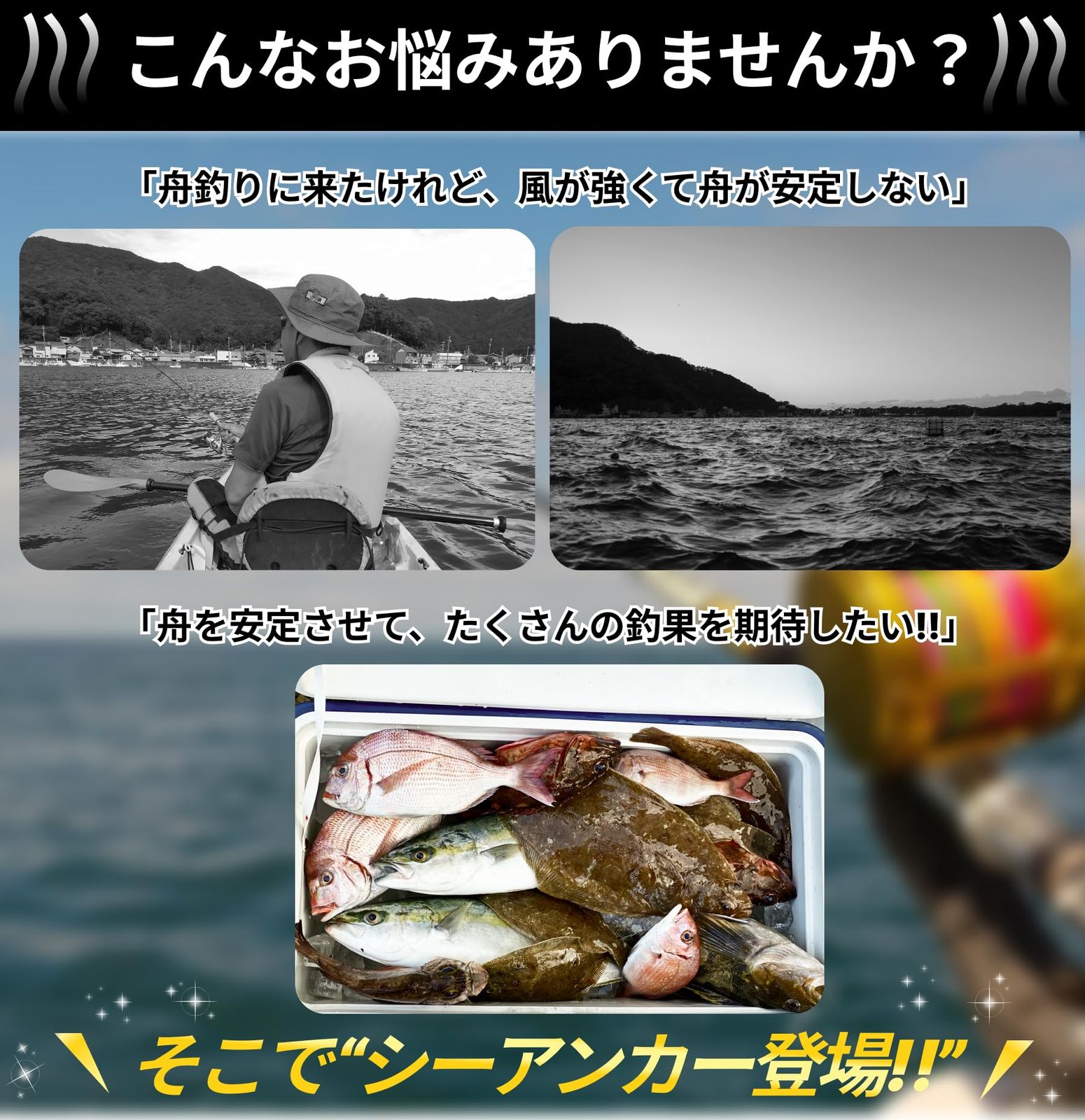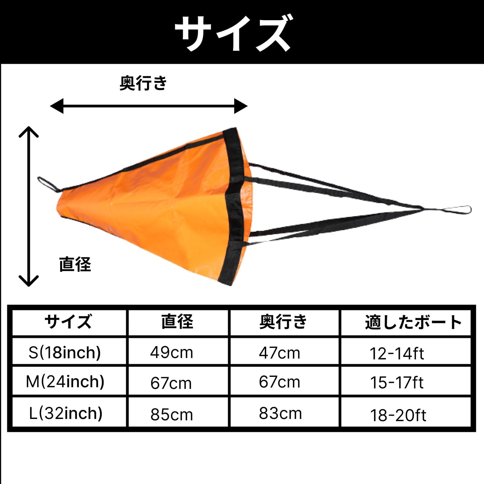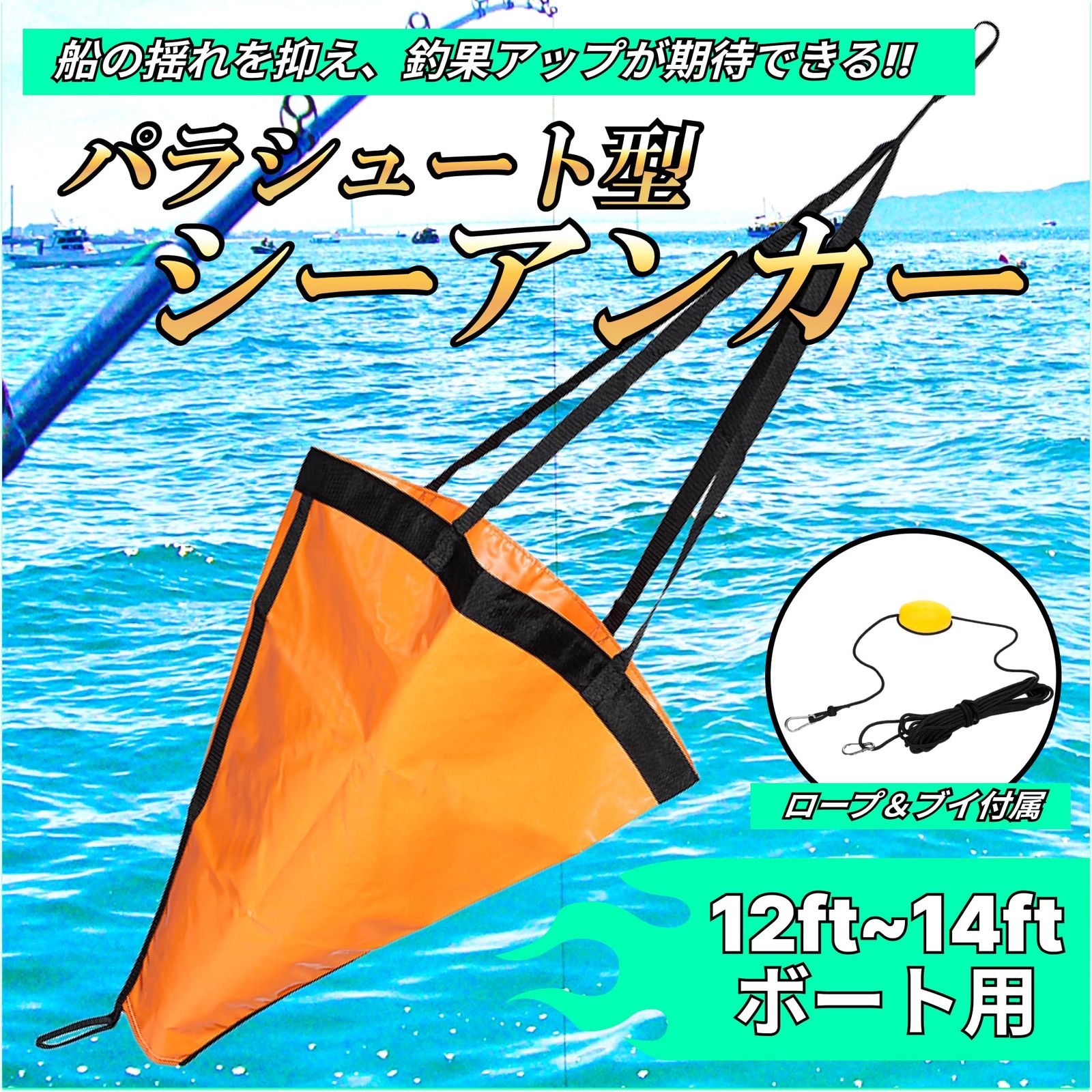 風の強い中、船体を安定させるのに役立つのがこのパラシュートアンカーです。釣りなどをしているときに、船体を安定させるために大いに役立ちます。本商品は、広くボート、たとえばスタンドアップパドルボート、パワーボート、セイルボート、カヌー、カヤック、インフレータブルボート、そして帆船、ヨットなどにもご利用頂けます。船の大きさに応じた、シーアンカーのサイズをご用意させて頂いております。商品内容は、バラシュートアンカー、フロート(ブイ)、そしてカラビナ付きロープのセットですので、すぐにご利用頂けます。パラシュートアンカーは、PVC(ポリ塩化ビニル)製です。二層構造で二重に出来ているので、丈夫で、耐久性に優れています。また、折り畳み式かつ軽量設計なので、利用時・持ち帰り時の持ち運びにも便利です。【特徴:1アンカーの機能・2シーアンカーの回収に役立つフロート・3コンパクトな収納】