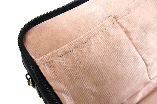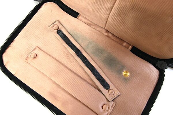 状態:外側:所々スレ・薄汚れあり、背面に引っ掛けキズあり。ファスナー生地に若干毛羽立ちあり。内側:スレ、薄汚れあり。ピアスホルダー下に黒い汚れあり。金具:小キズ、スレあり。