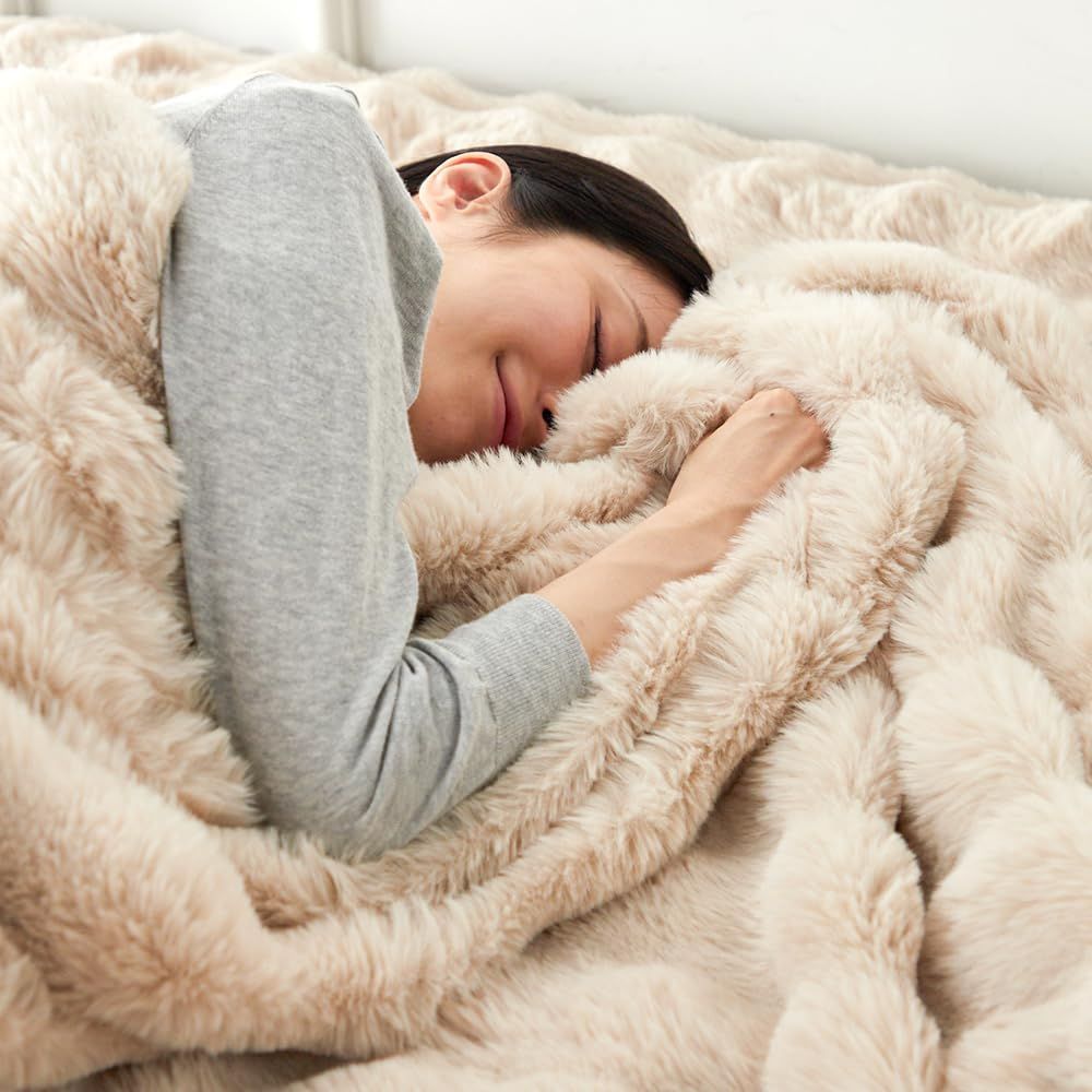 ロングパイルファー仕立てで、ずっと触れていたいタッチ感が癖になる2枚合わせの毛布です。