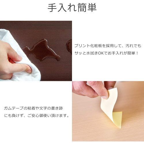 【木目の立体感までを再現した美しい木目模様天板】なめらかな手触り天板は高級感といい肌触りが兼ね備える上、水や汚れに強く、耐久性も優れて、お手入れも簡単です。汚れた時もサッと簡単に拭けます。