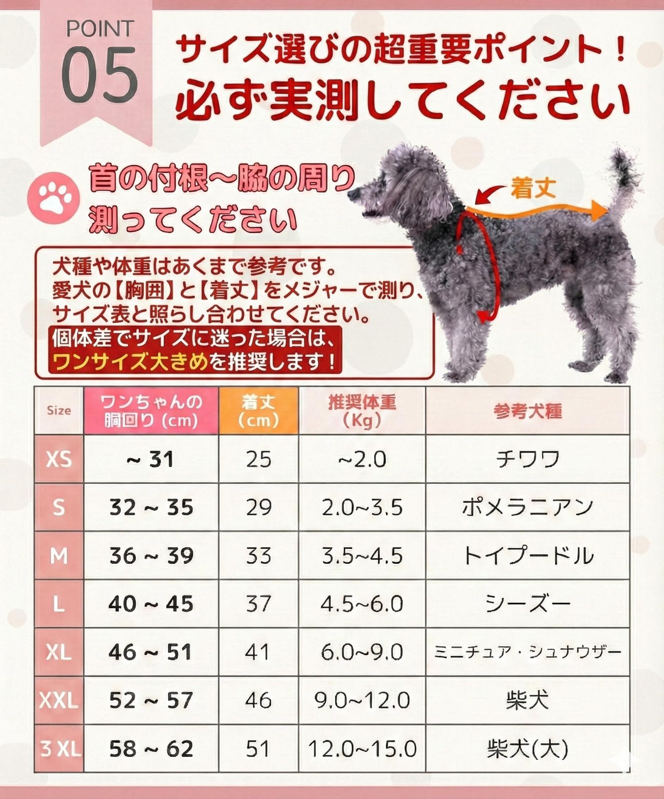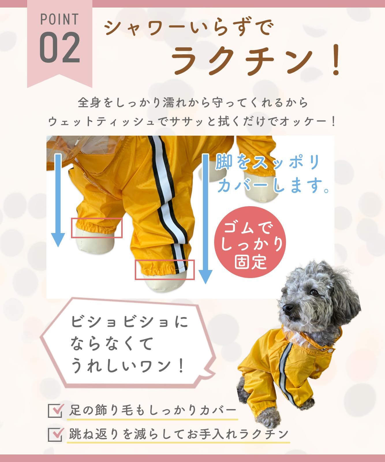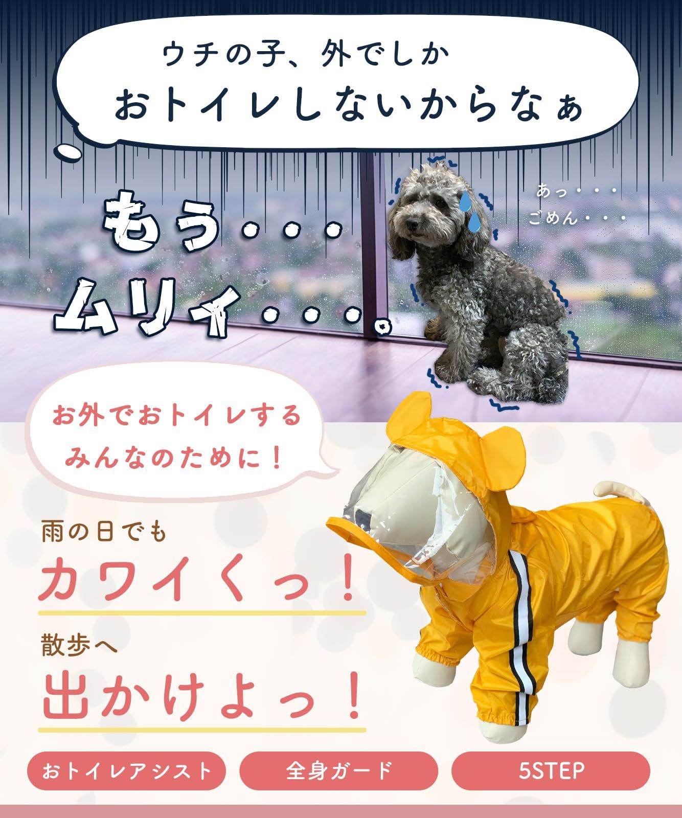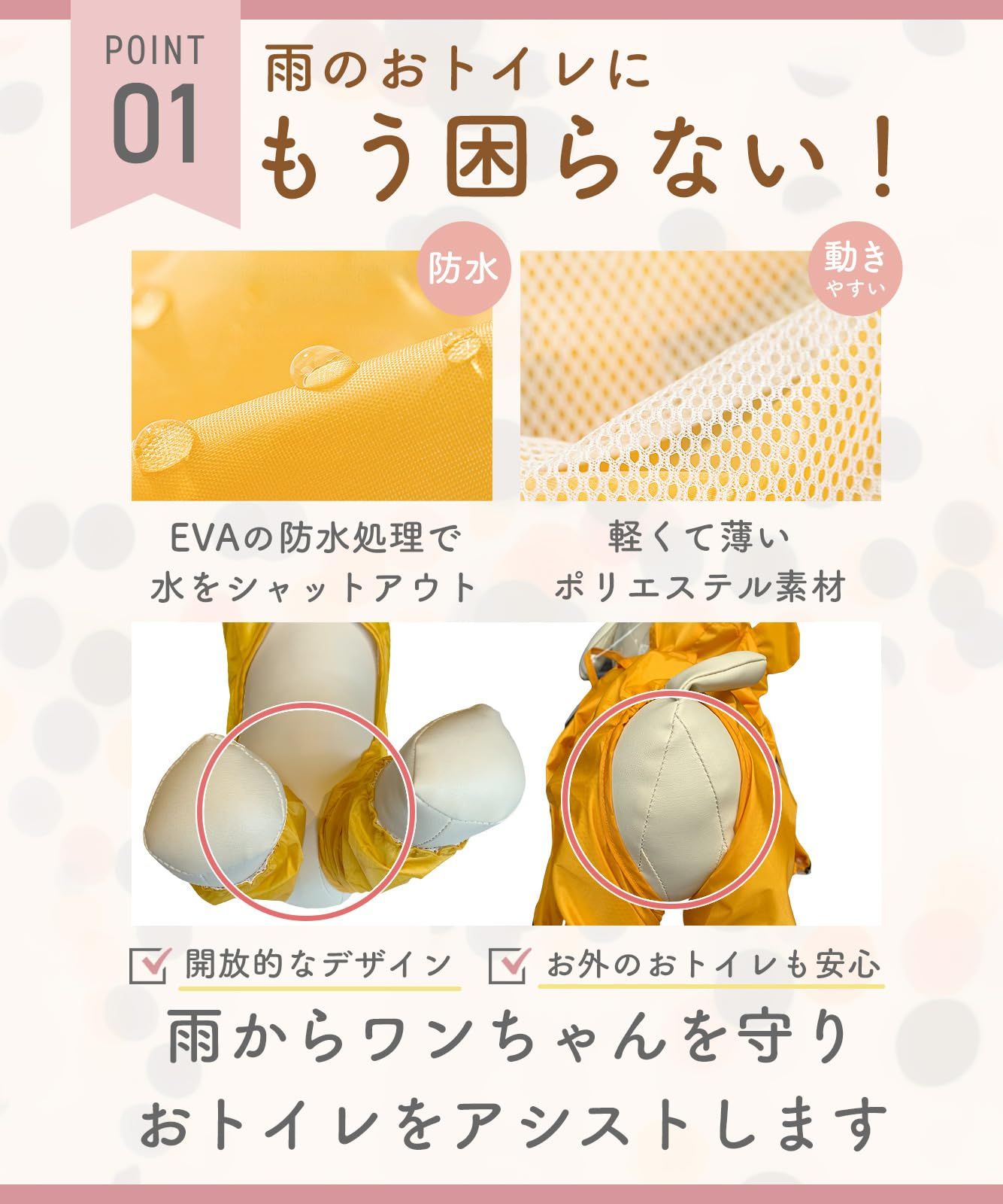 🐶【ビショビショ防止】レインコート生地にEVA防水処理を施すことで、突然の大雨からも愛犬を守ります。雨散歩後のビショビショやドロドロを防いでくれるので、お外に出しずらい梅雨の時期も安心です。🐶【動きやすさ重視】防水性能を重視しすぎて重くて動きにくい素材で愛犬の散歩意欲を削いでしまっては意味がないと私たちは考え、軽くて薄いポリエステル素材を使用しています。ワンちゃんの軽快な動きをサポートします。🐶【簡単着脱】5STEPでカンタンに着脱できるようになっています。カンタンな取扱説明書付きなのでめんどくさがり屋のあなたにもオススメです。🐶【開放的なデザイン】雨の日でも愛犬を散歩に連れて行く理由として最も多く挙げられたのが、『愛犬が外でしかおトイレできないから』でした。私たちのレインコートは、男の子も女の子もおトイレができるようにデザインしています。🐶【30日間返金保証】お客様に安心してお使いいただくため、ご満足いただけなかった場合にどんな理由でも返金保証を承っております。詳しくは同封の取扱説明書をご覧ください。