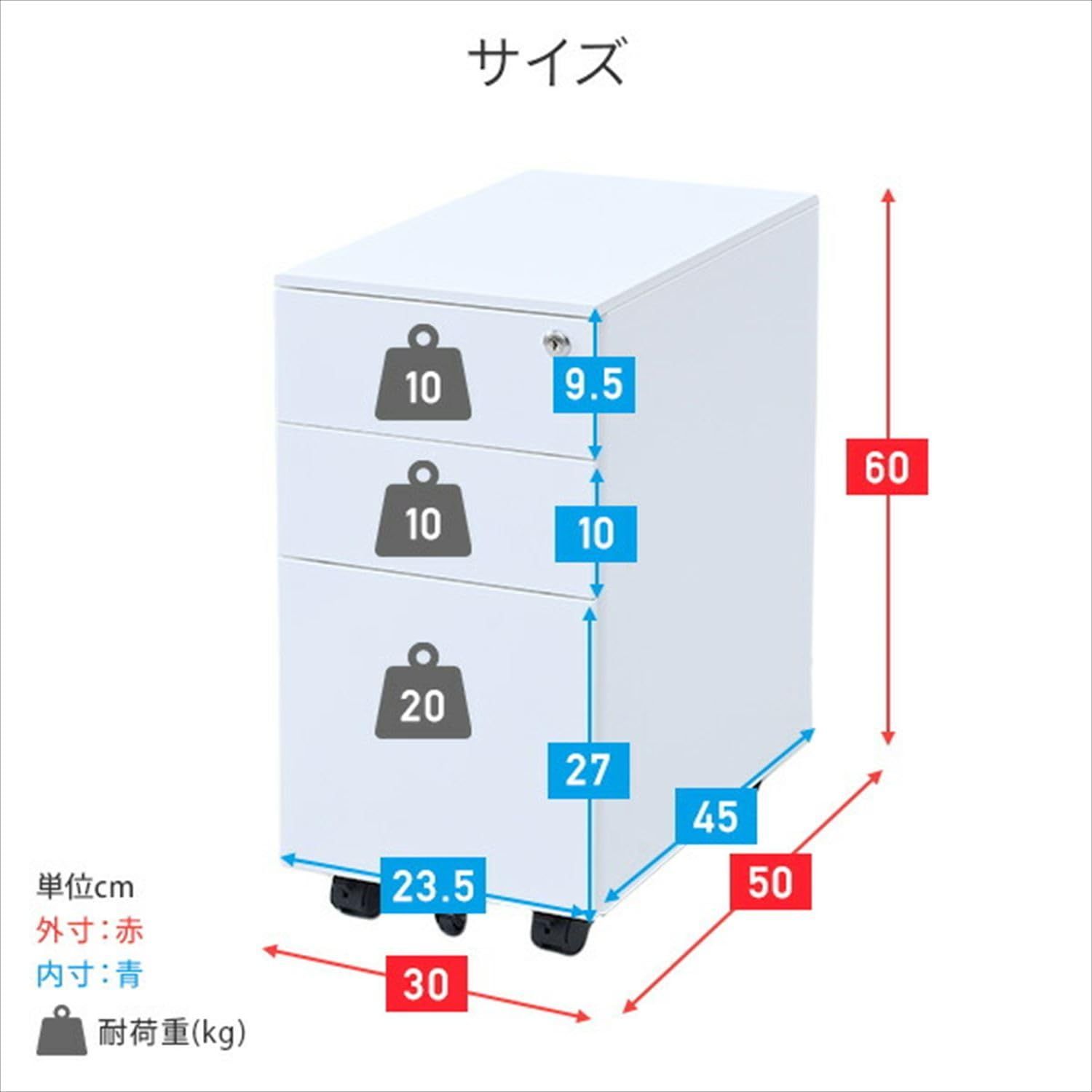 ●本体サイズ(約) : 幅30×奥行50×高さ60cm●収納内寸 : 上段引き出し 23.5×45×6(壁面の高さ)/9.5(底~天面裏側)cm、中段引き出し 23.5×45×6(壁面の高さ)/10(底~天面裏側)cm、下段引き出し 23.5×45×24(壁面の高さ)/27(底~天面裏側)cm●構造部材 : 本体/金属(スチール)、キャスター/ナイロン●表面加工 : 本体/エポキシ樹脂塗装●耐荷重 : 全体40kg(上段10kg、中段10kg、下段20kg)●付属品 : 鍵×2、ペントレー×1、仕切り板(下段)×1●東証プライム(株)山善で扱うすべての山善商品は、自社もしくは第三者機関において、JIS規格に基づいた品質試験を行っております。