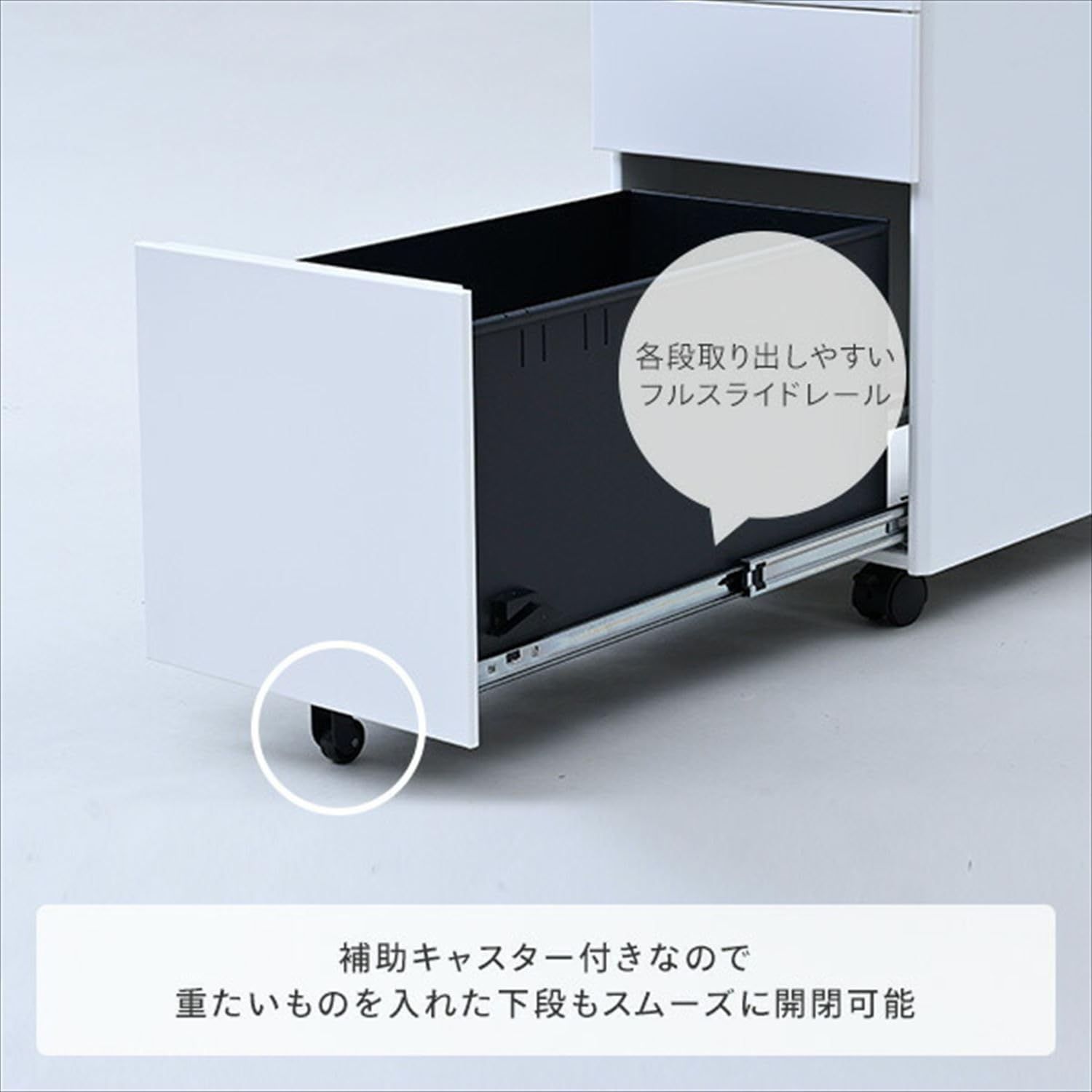 【フルスライドレール】各段フルスライドレールで、引き出しがスムーズで奥の物も取り出しやすいです。転倒防止のため、引き出しは1段引き出すと他の段は引けなくなる安全に配慮した仕様です。