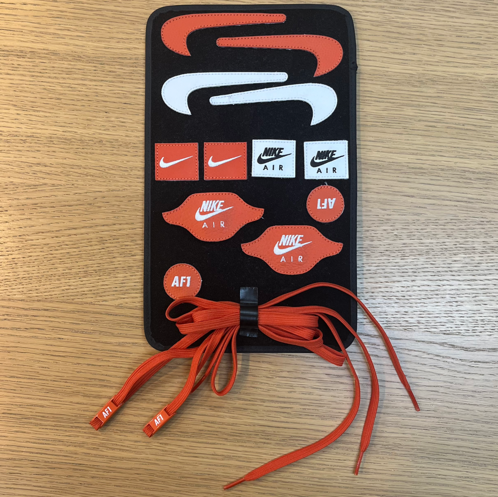 スウッシュ風ロゴパーツ、AF1ロゴパーツ、NIKE AIRロゴパーツ、替え紐などが一式揃っており、お手持ちのAIR FORCE 1を簡単にオリジナルカスタム仕様へ変更可能です。