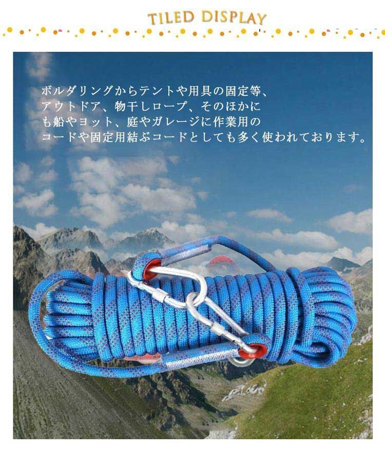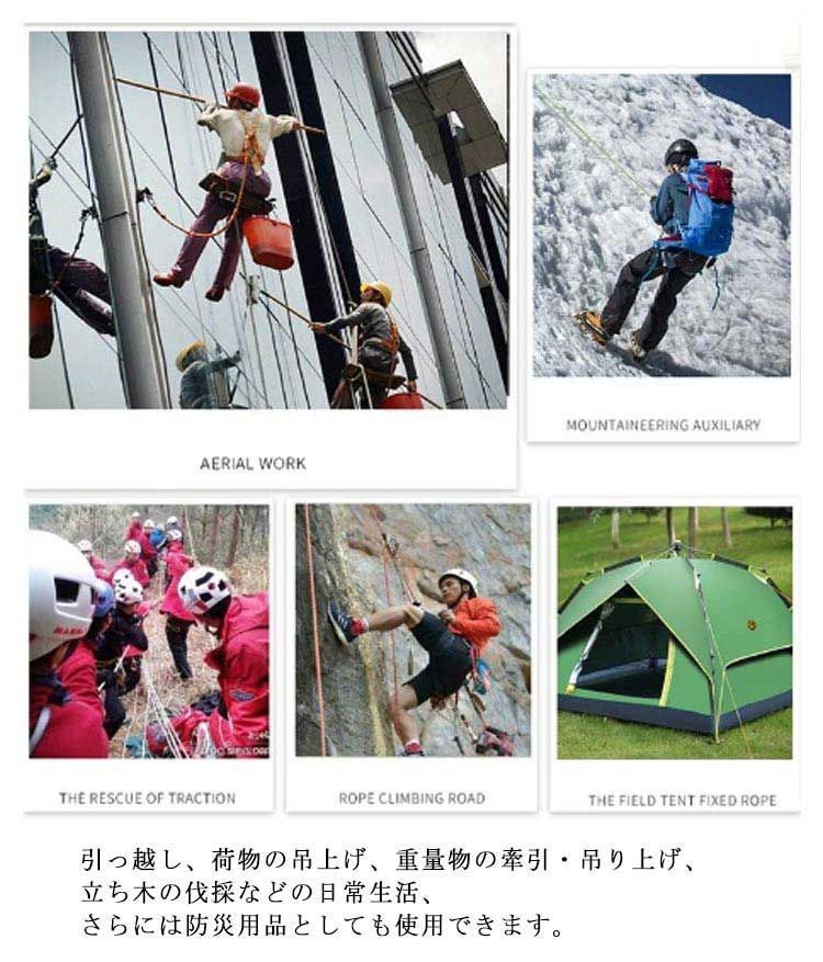 ボルダリングからテントや用具の固定等、アウトドア、物干しロープ、そのほかにも船やヨット、庭やガレージに作業用のコードや固定用結ぶコードとしても多く使われております。引っ越し、荷物の吊上げ、重量物の牽引・吊り上げ、立ち木の伐採などの日常生活、さらには防災用品としても使用できます。