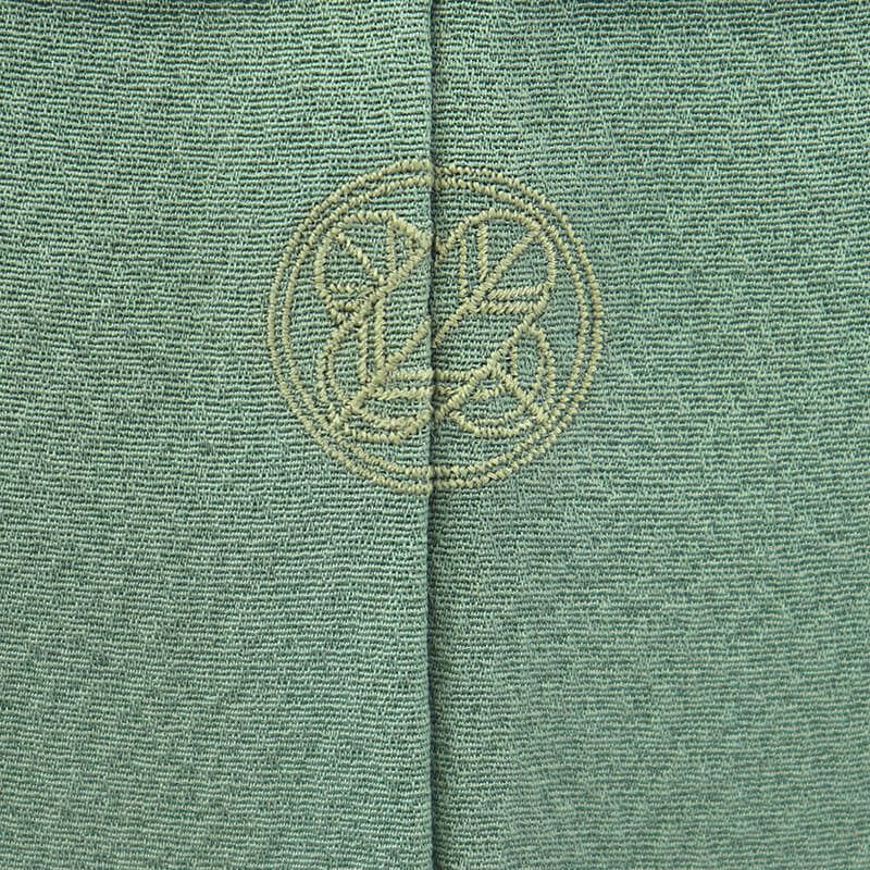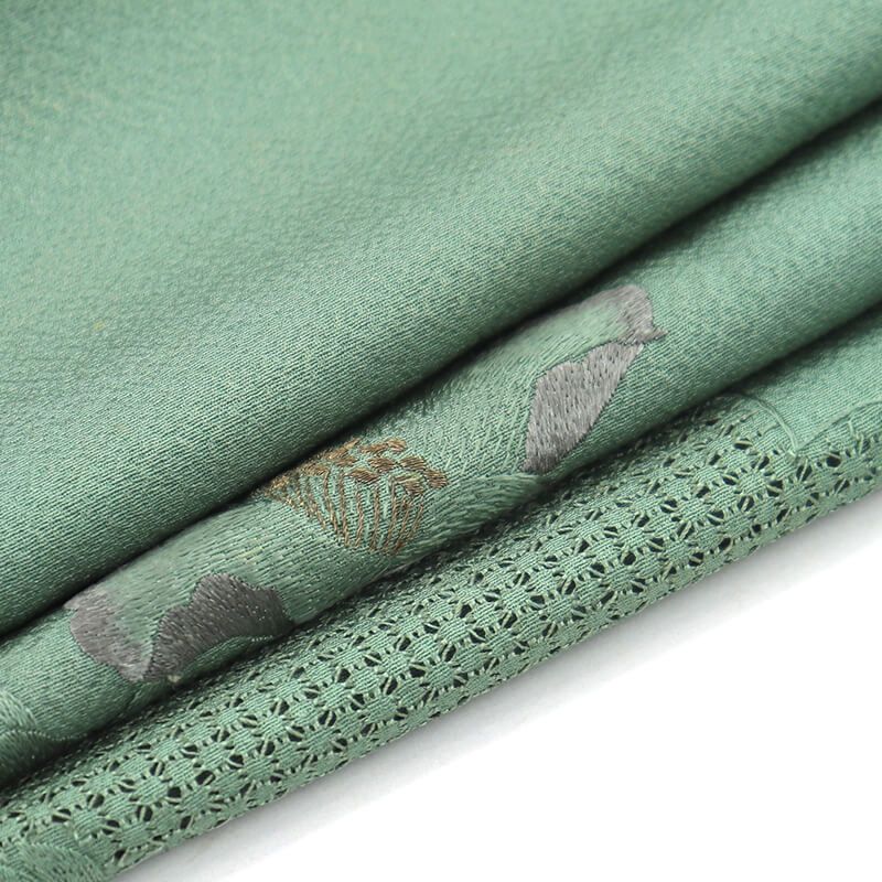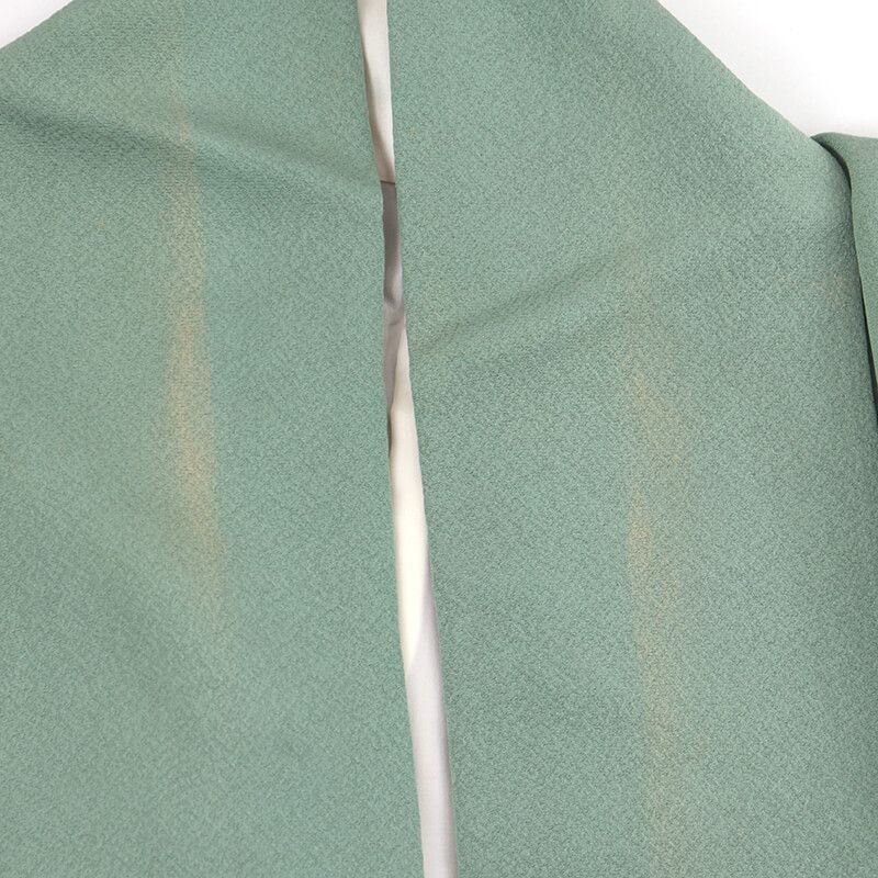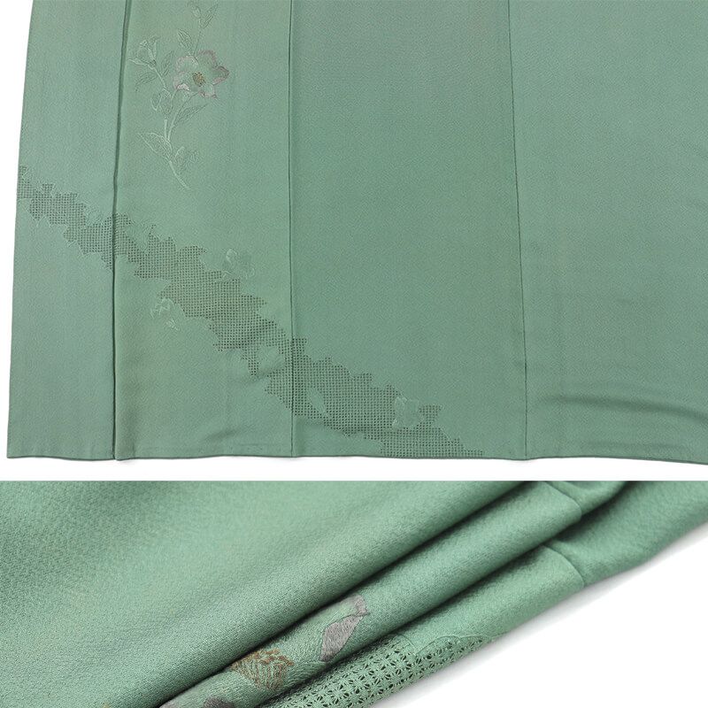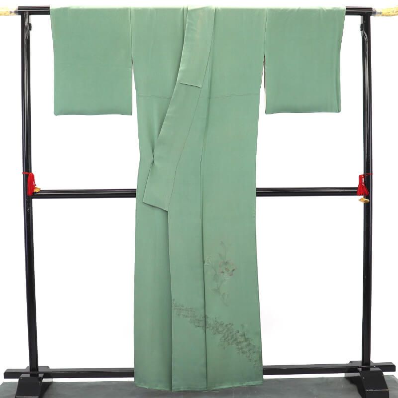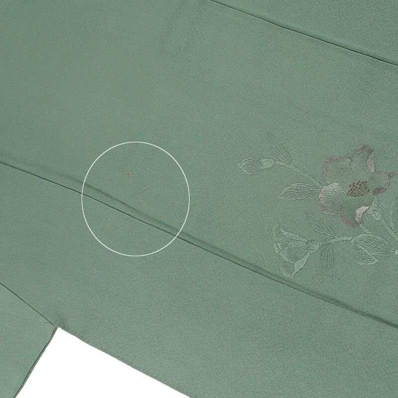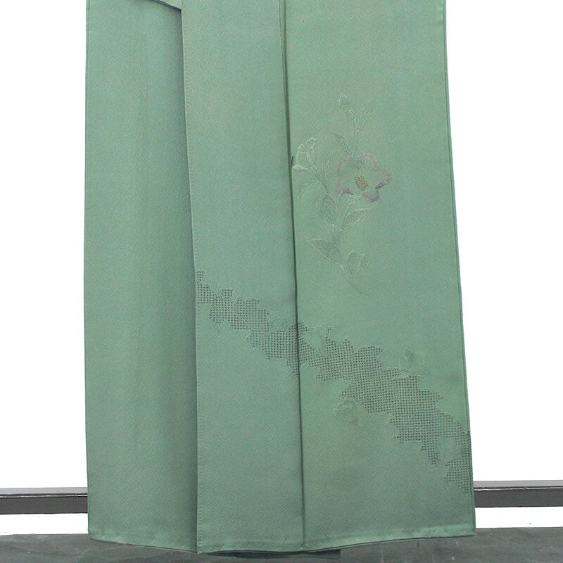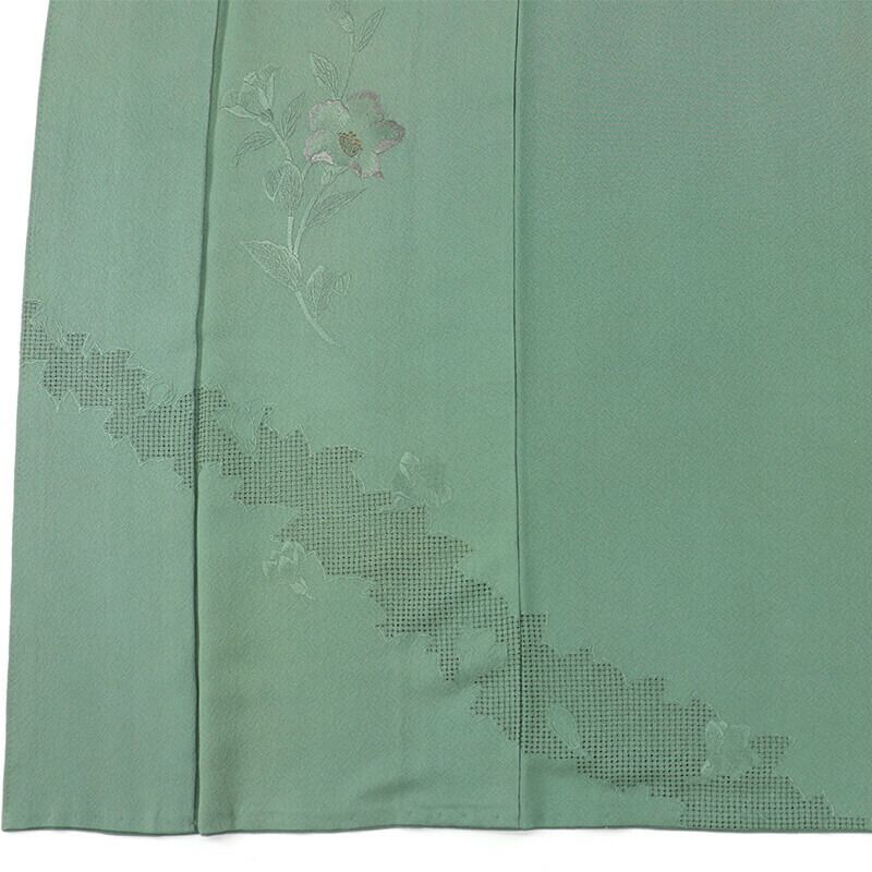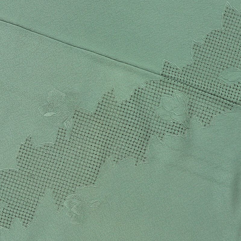 上品な柔らかな緑色に、汕頭刺繍などの刺繍を用いた花柄などが美しい付下げです。無地付下げのような感覚で、メインのお花の部分には、ほんのり赤みのある色を用いております。刺繍で魅せる柔らかな柄使いは、凛とした美しさを感じます。