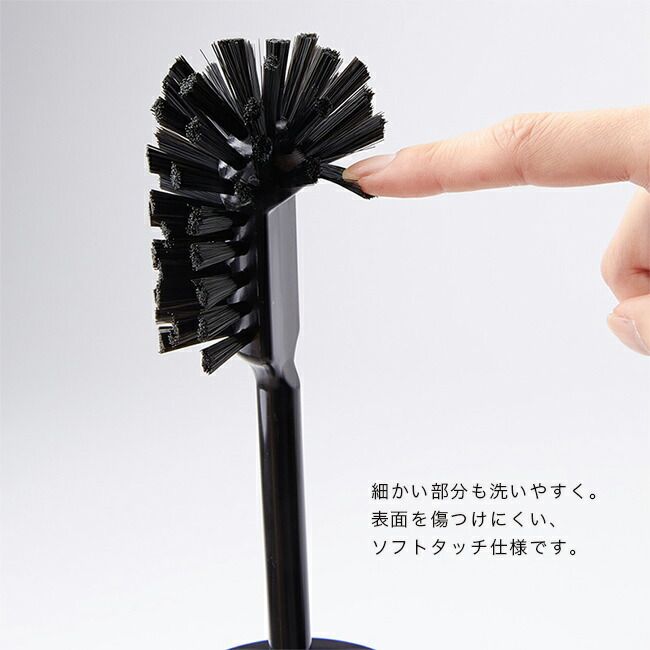 ナイロン製のソフトタッチブラシが、便器の細部までフィット。黒いブラシは汚れが目立ちにくく、乾きやすい構造で衛生的。