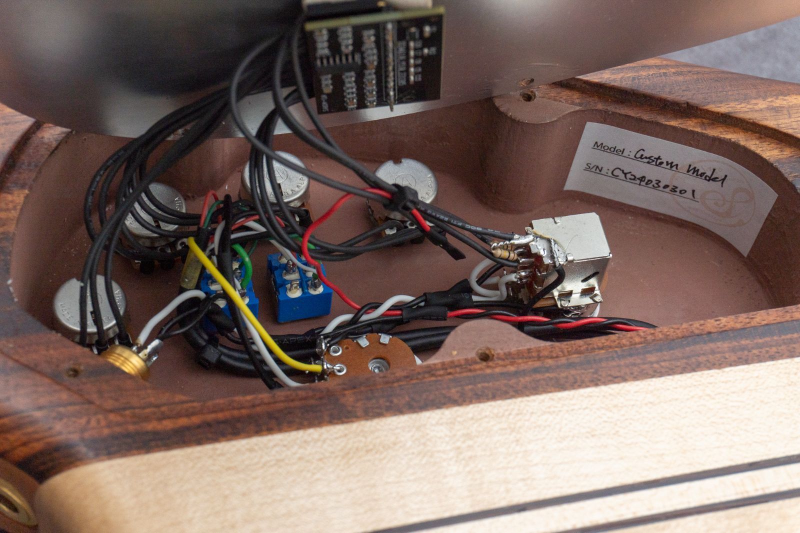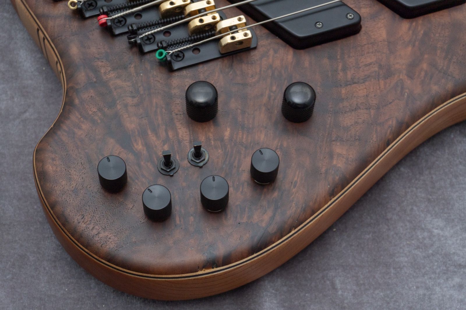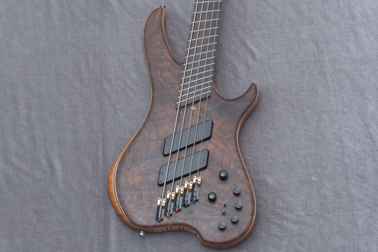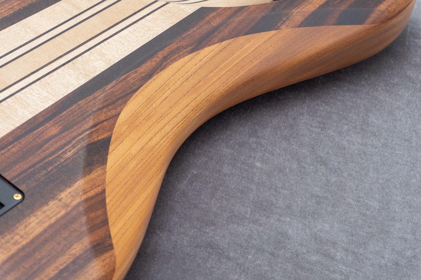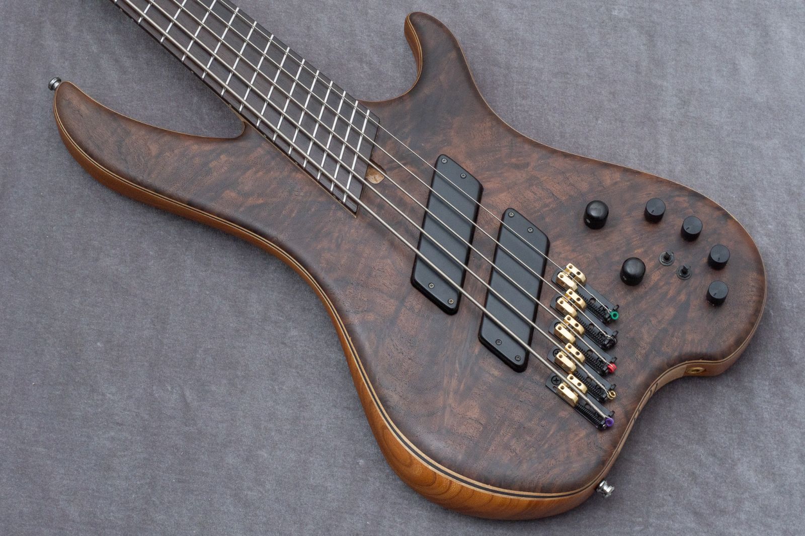 スルーネック構造で、ボディウィングのバック材にはkeyaki、トップ材にはclaro walnutを使用。