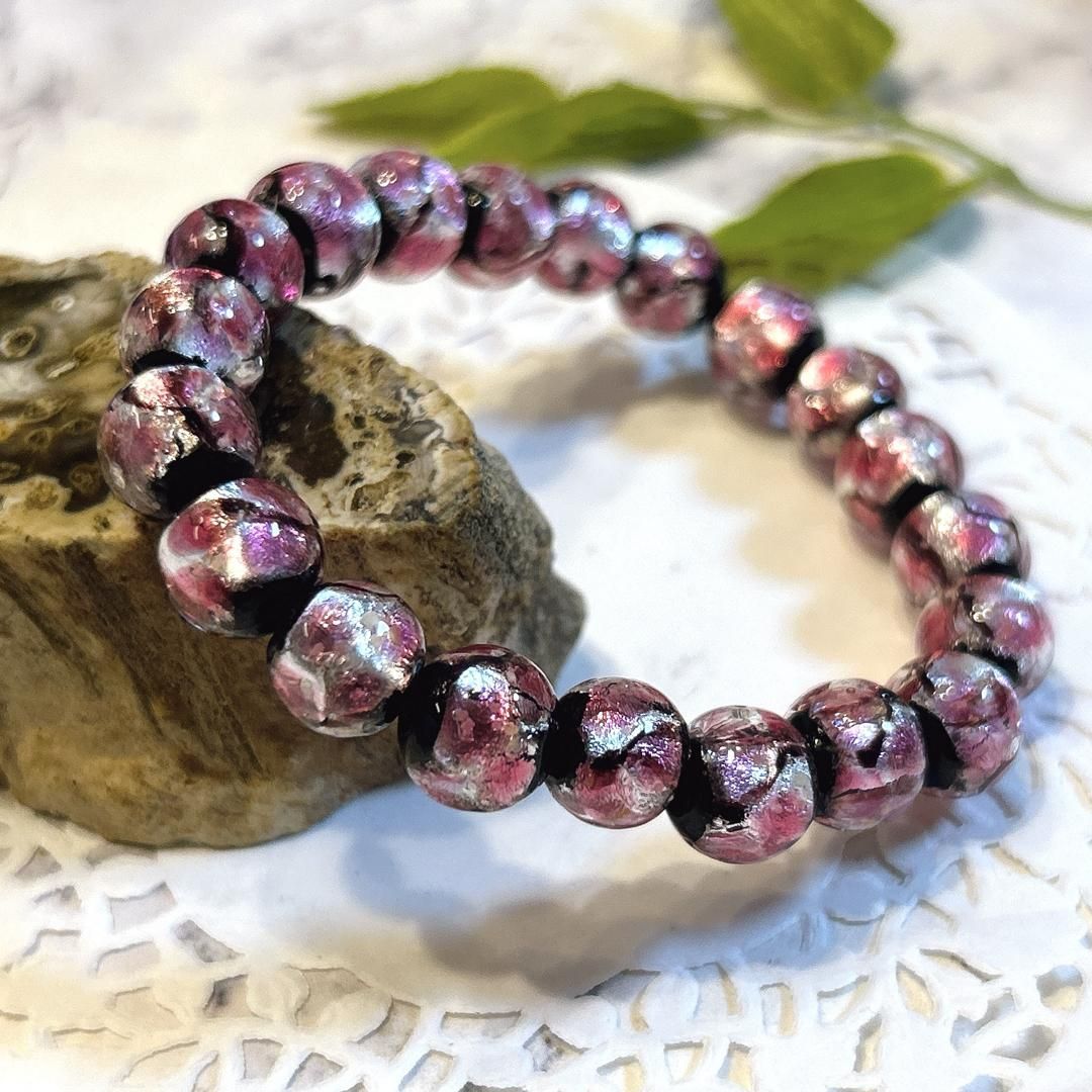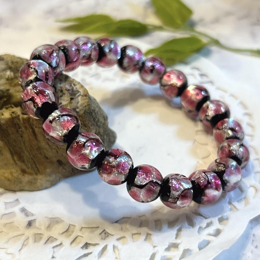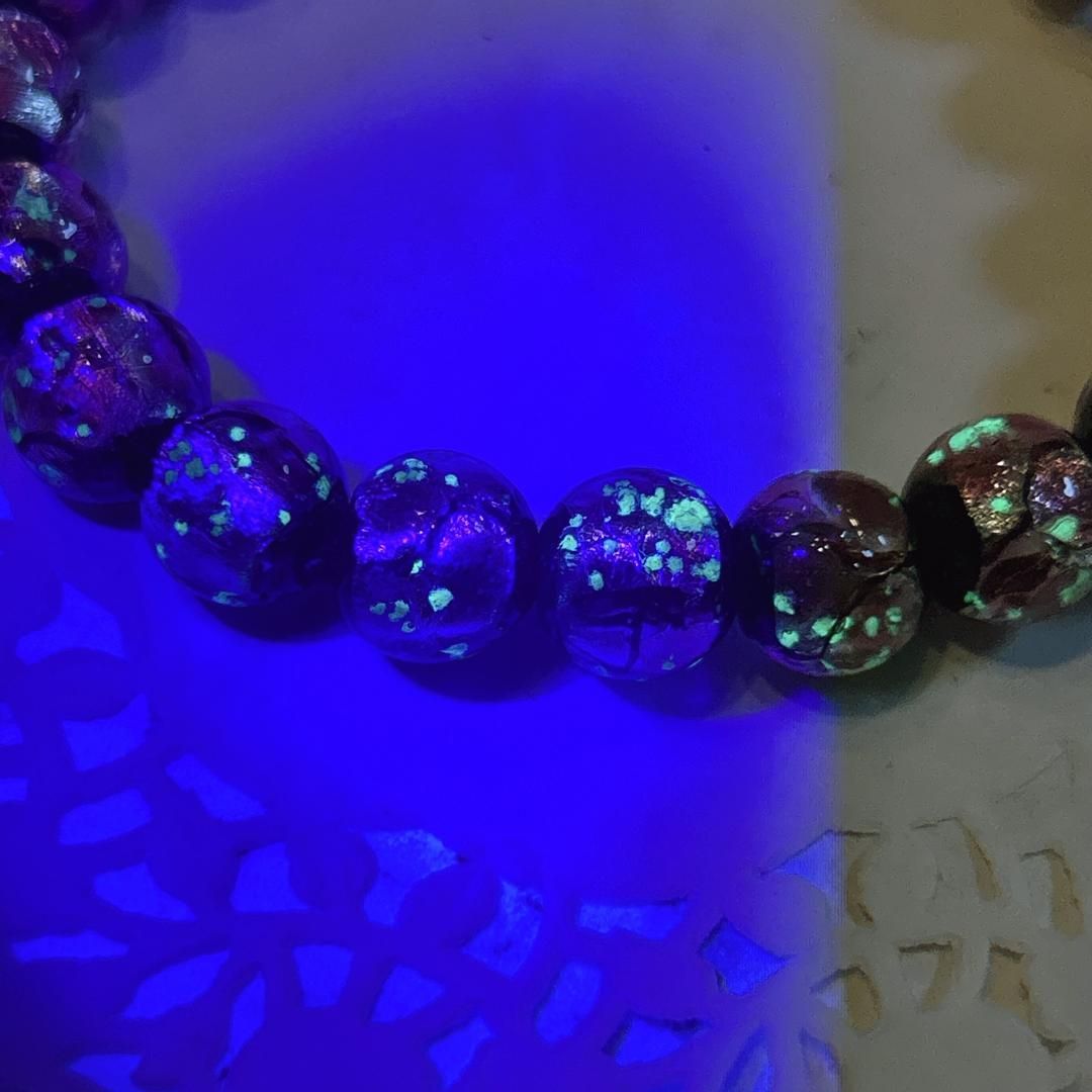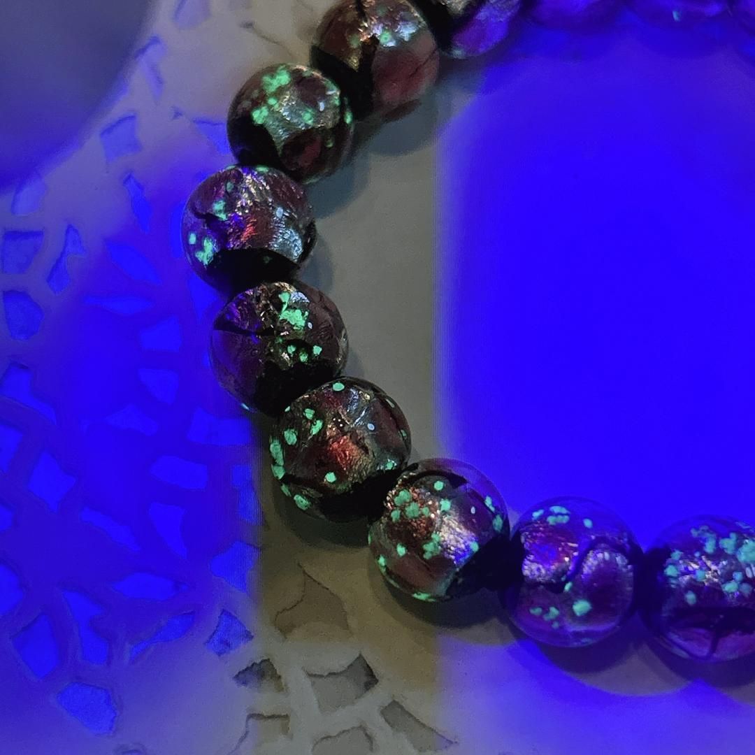 ピンクのビーズにブラックライトを当てると、緑の光が浮かび上がる不思議なホタルガラス。
