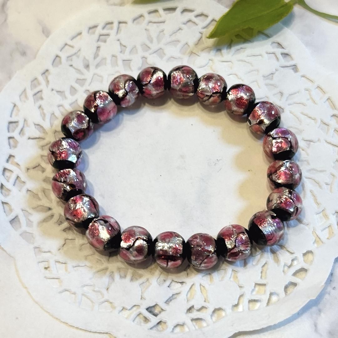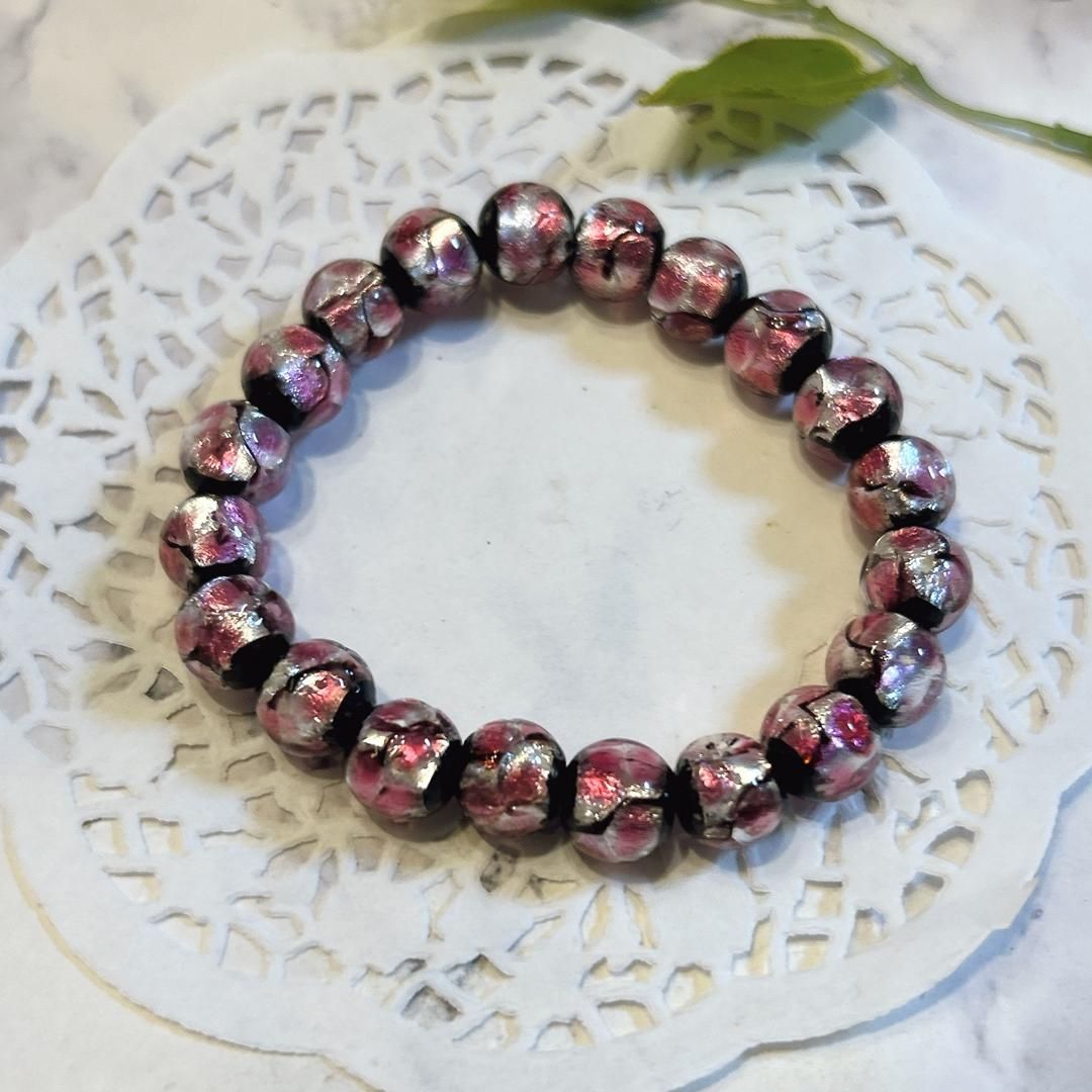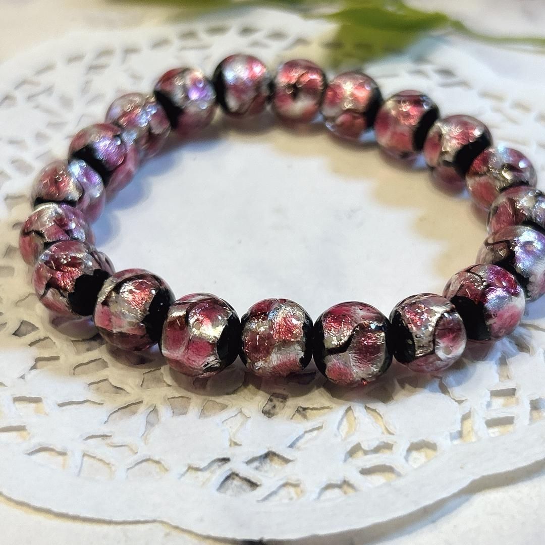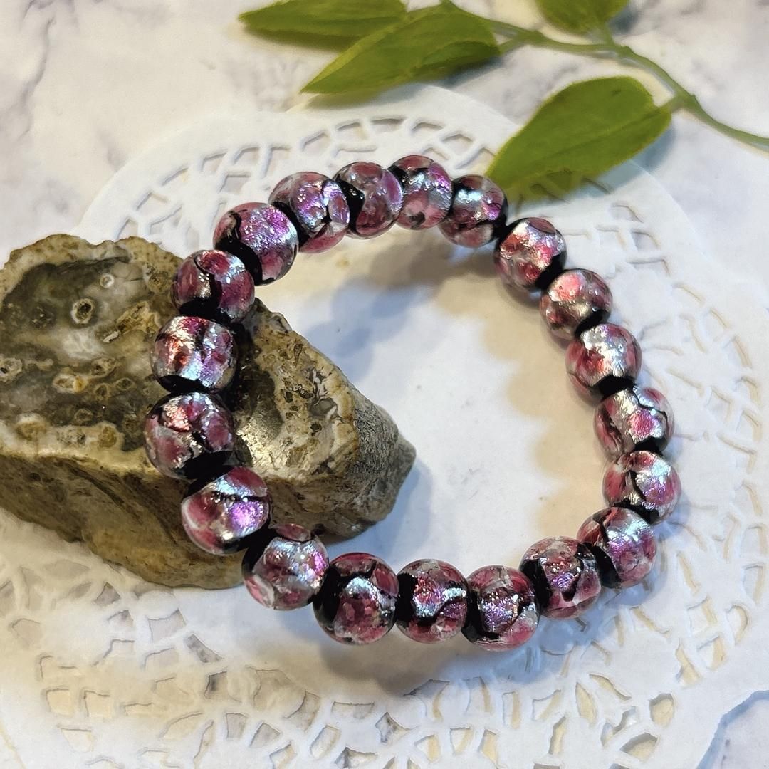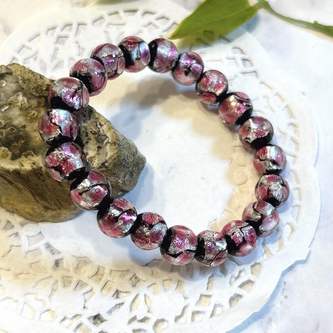 ピンクのビーズにブラックライトを当てると、緑の光が浮かび上がる不思議なホタルガラス。