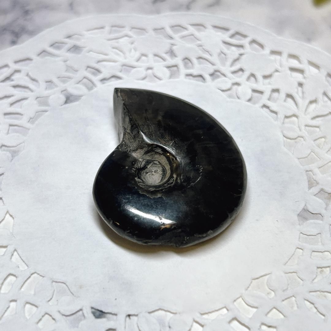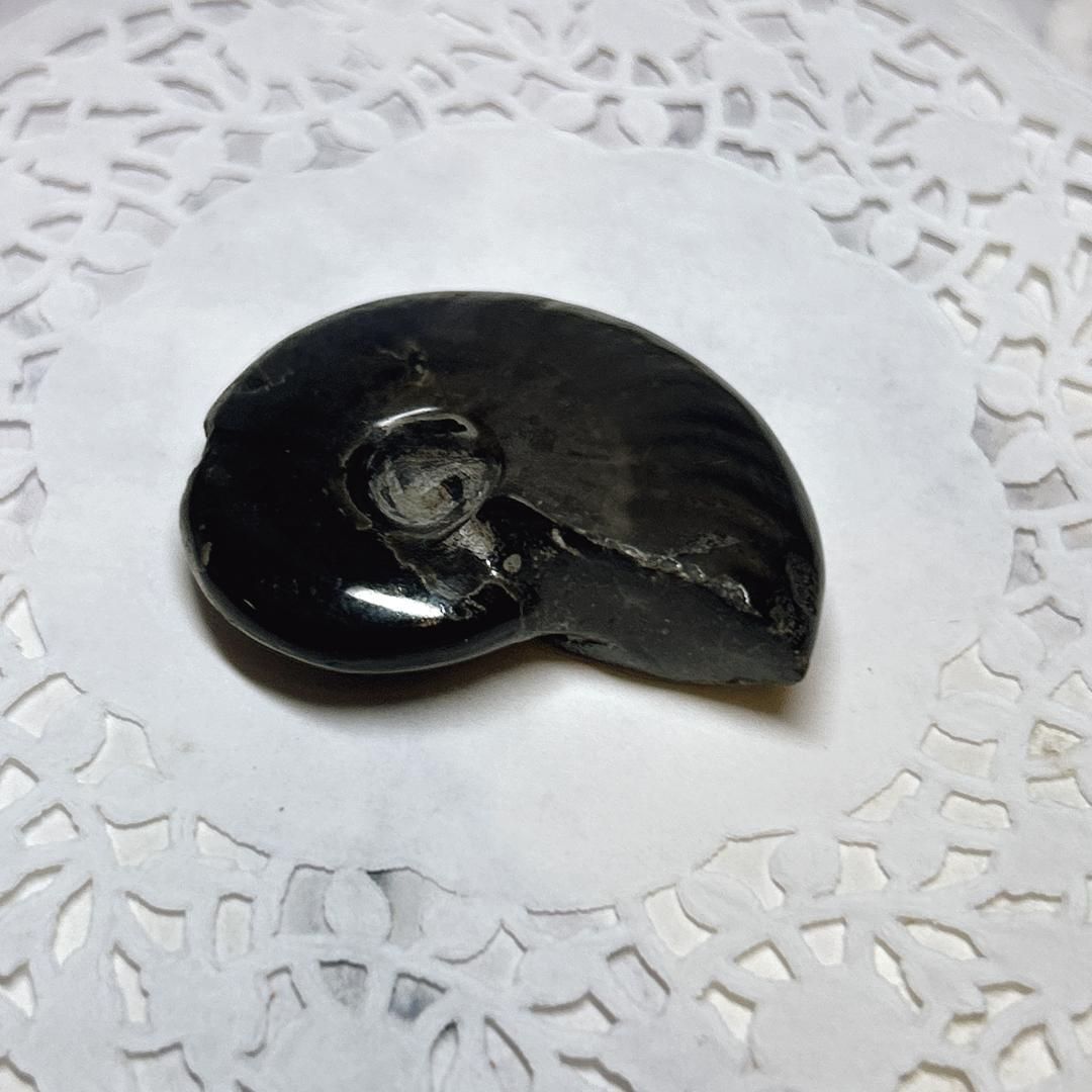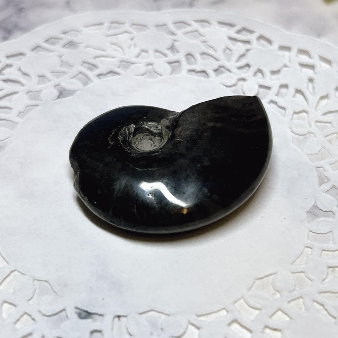 赤鉄鉱(Hematite)または磁赤鉄鉱(Maghemite)になって黒くなったアンモナイト。磁石を近づけて反応すれば磁赤鉄鉱。