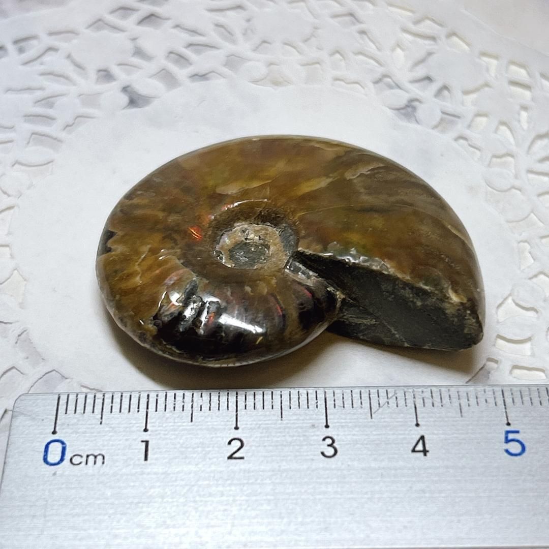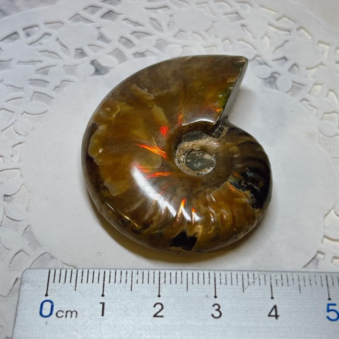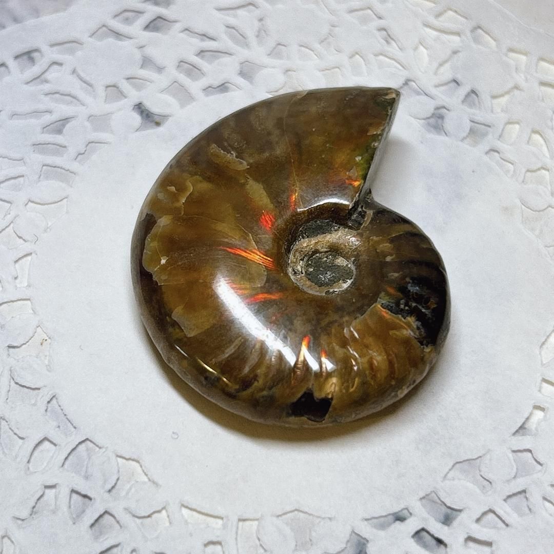 強い赤色の閃光(ファイヤー)を放っているのは、地層中の酸化鉄や珪酸がアンモナイトの殻の表面に薄く付着し、細かなひび割れの部分がオパールのような遊色を浮き出させるため。