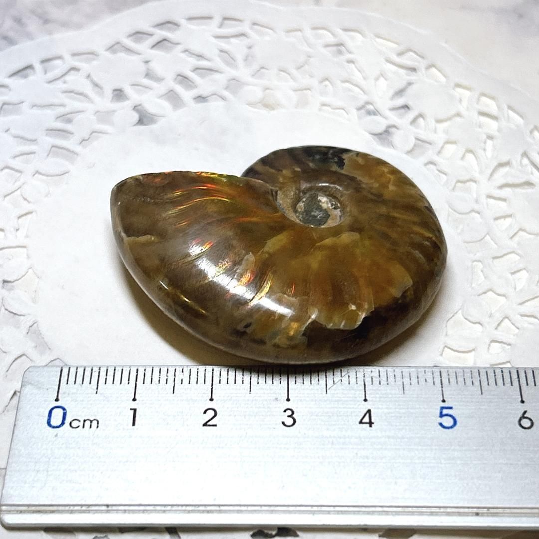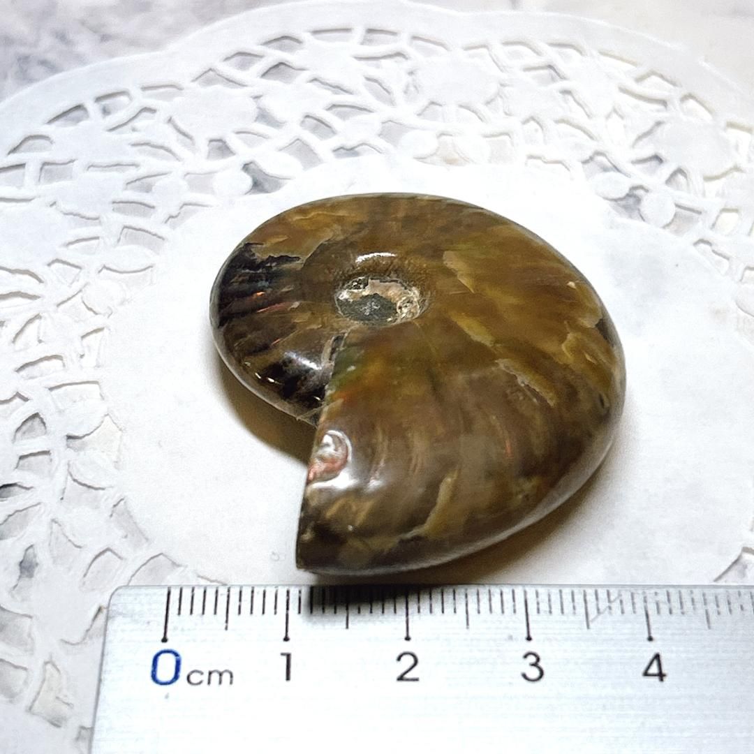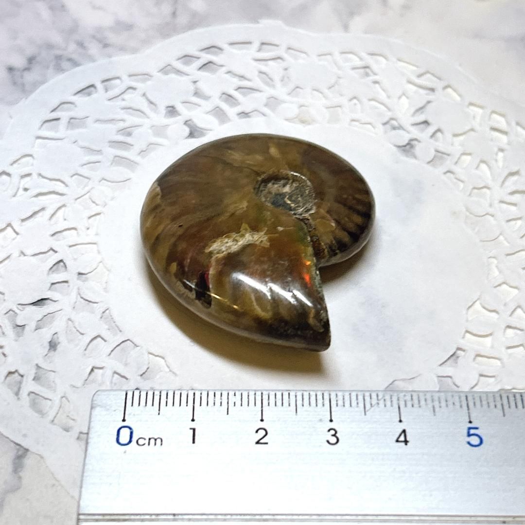 強い赤色の閃光(ファイヤー)を放っているのは、地層中の酸化鉄や珪酸がアンモナイトの殻の表面に薄く付着し、細かなひび割れの部分がオパールのような遊色を浮き出させるため。