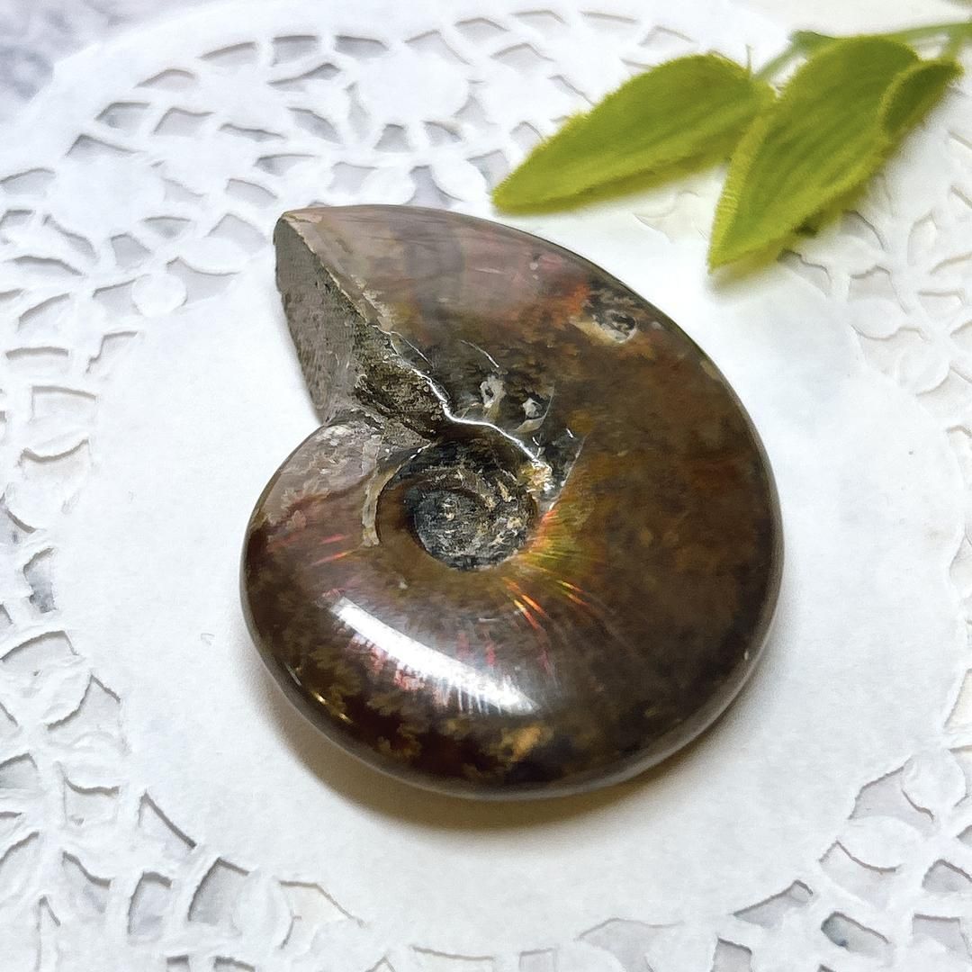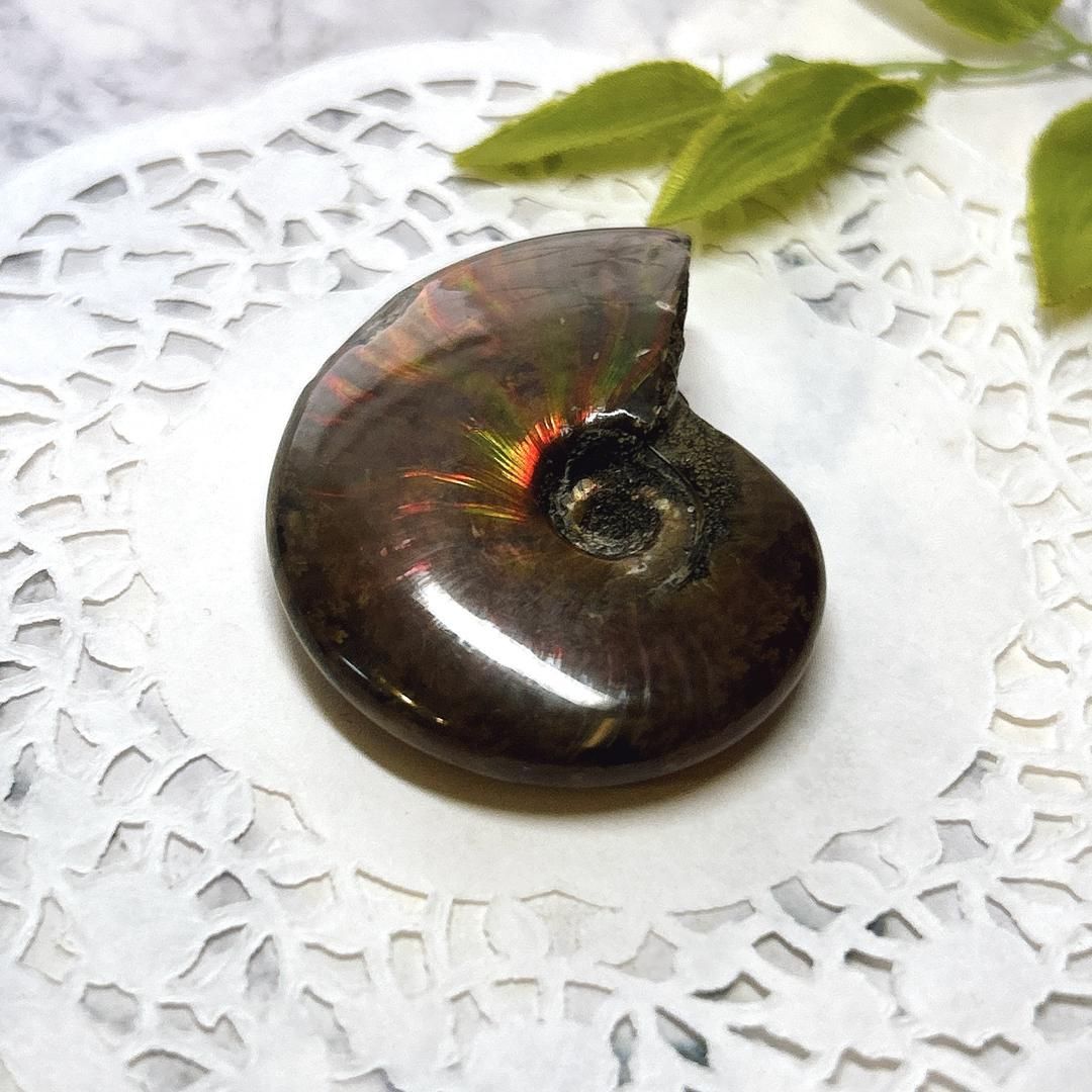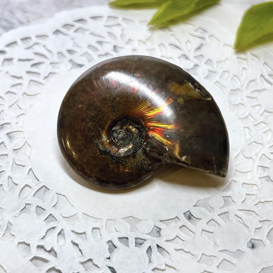 強い赤色の閃光(ファイヤー)を放っているのは、地層中の酸化鉄や珪酸がアンモナイトの殻の表面に薄く付着し、細かなひび割れの部分がオパールのような遊色を浮き出させるため。