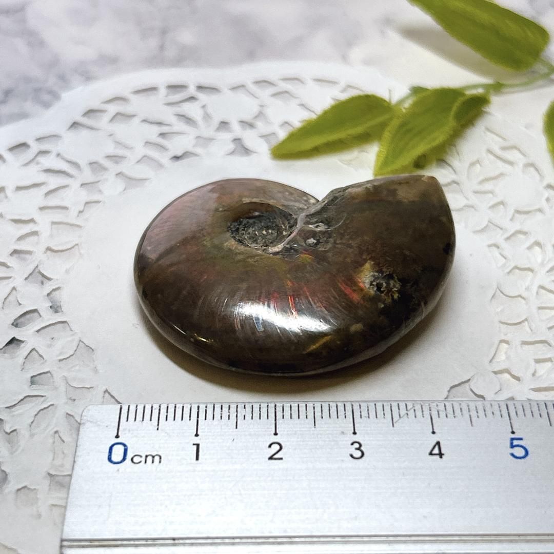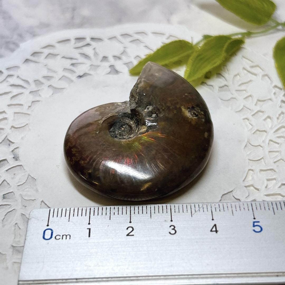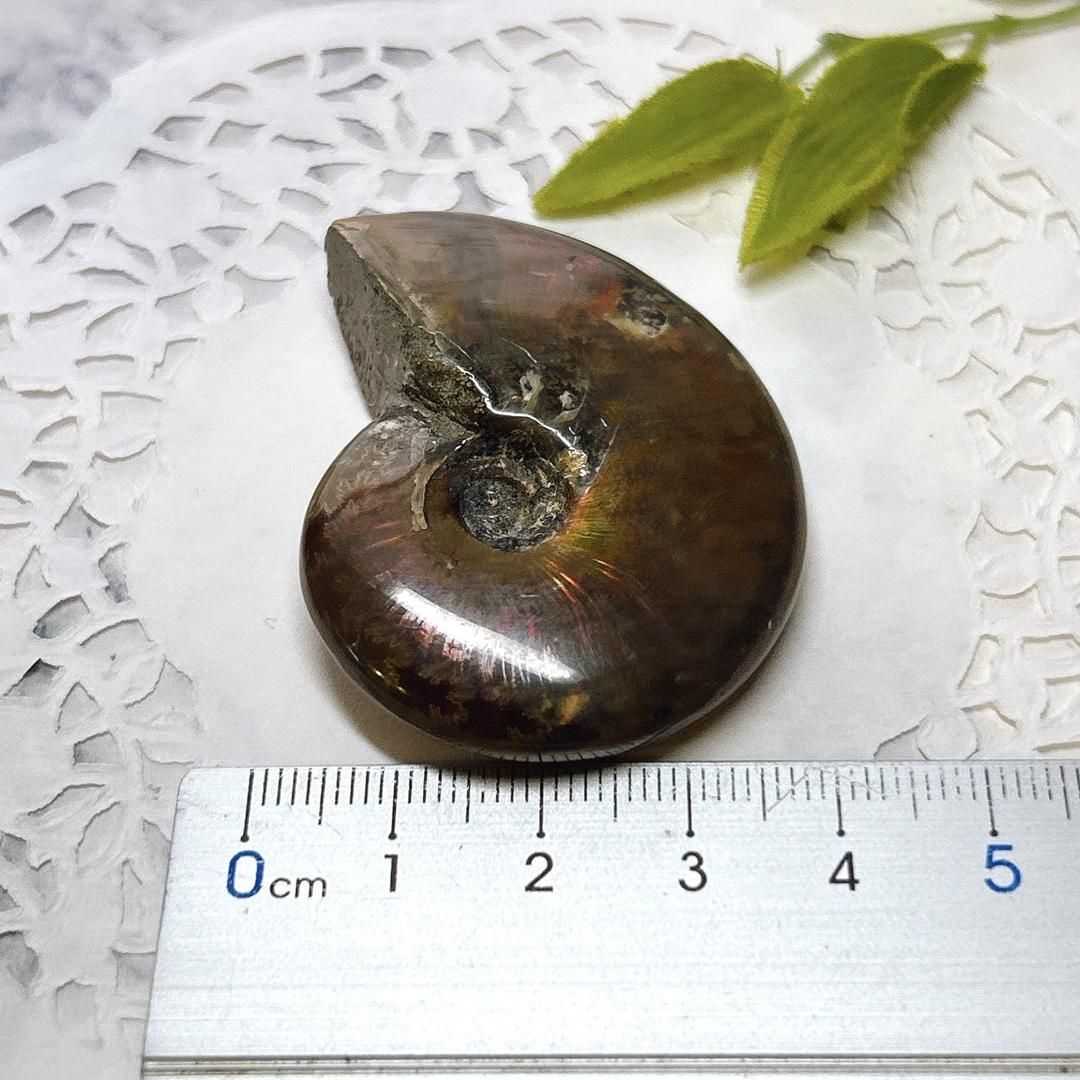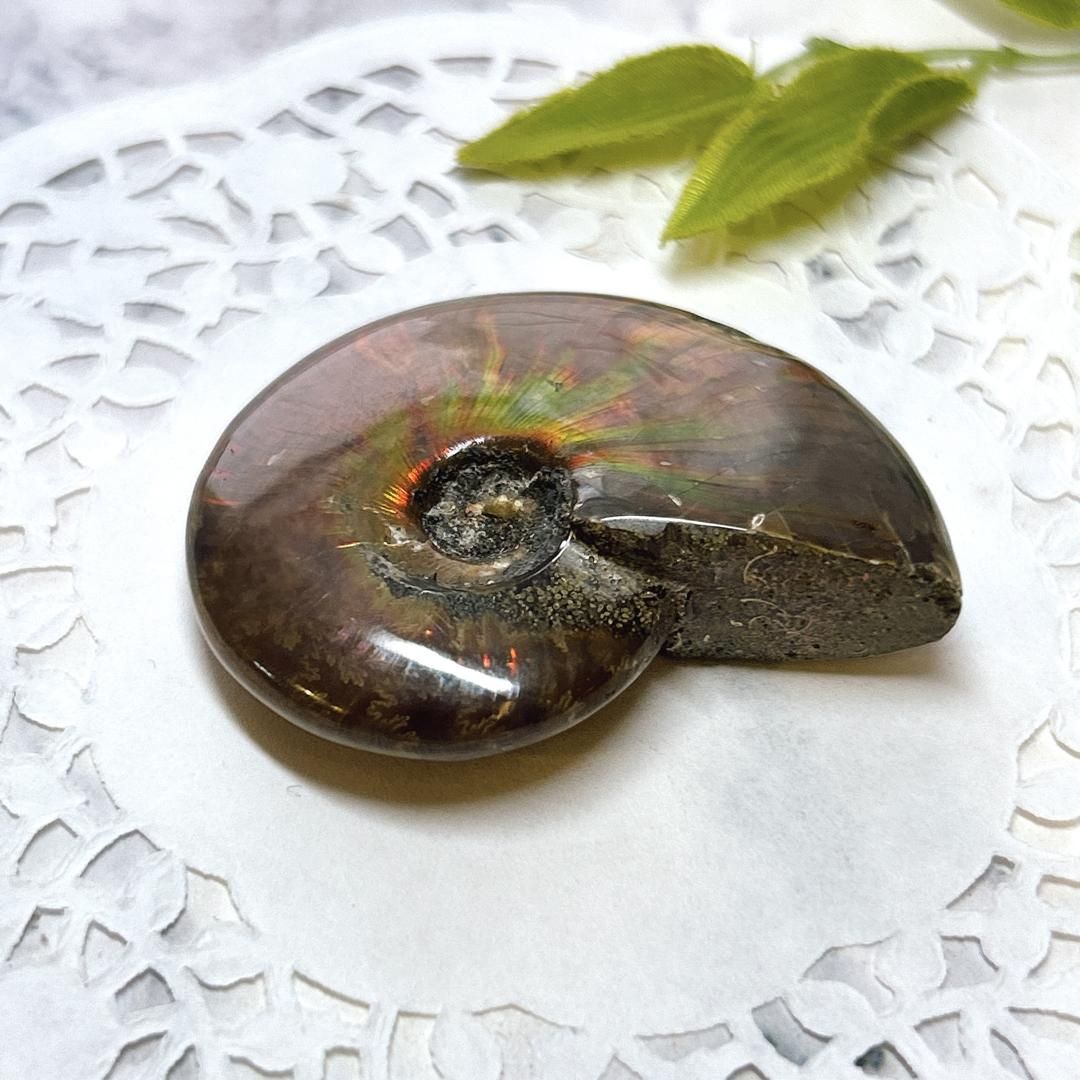 強い赤色の閃光(ファイヤー)を放っているのは、地層中の酸化鉄や珪酸がアンモナイトの殻の表面に薄く付着し、細かなひび割れの部分がオパールのような遊色を浮き出させるため。