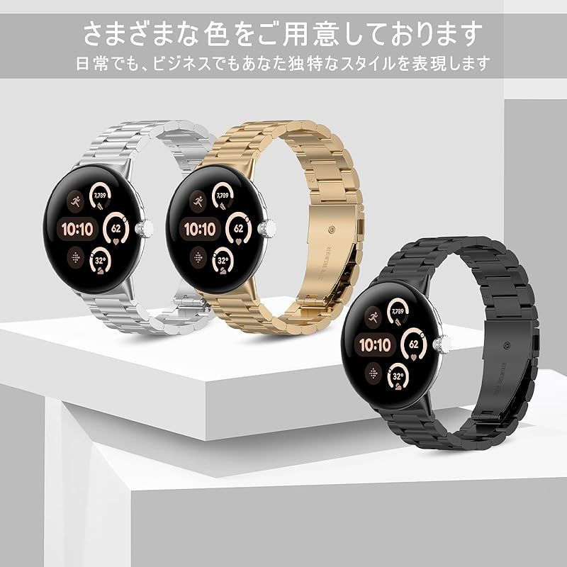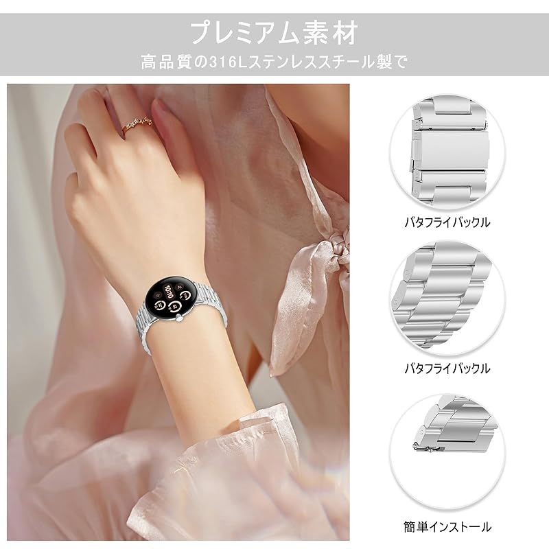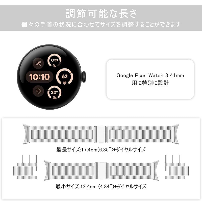 【対応機種】 このステンレス製交換用ストラップは、Google Pixel Watch 4 41mm/Google Pixel Watch 3 41mm/Google Pixel Watch 2/Google Pixel Watch。注意: ご購入前に、時計のモデルをご確認ください。スマートウォッチは付属しません