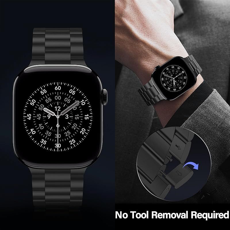 【工具を使わずに調整可能】工具を使わずに、手で時計バンドの長さを簡単に調整できます。チェーン間の接続を開くには、スプリング・リンクを引っ張り、リンクをねじって引き抜くだけ(最大8リンクまで取り外し可能)。ストラップを素早く短くしたり長くしたりして、手首にぴったりフィットさせます。