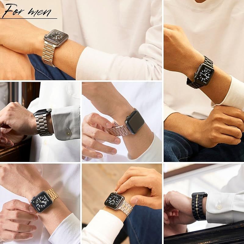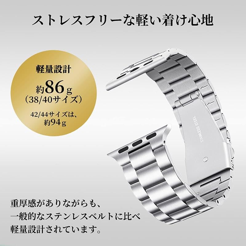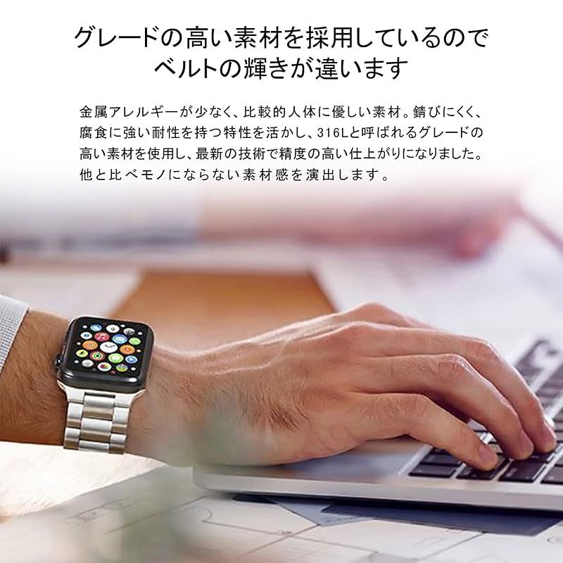 付属品:ステンレススチールのバンドはご自身の腕周りの長さに応じて調整が必要です。購入後すぐに使用できるように調整工具とベルト拭きをバンドと一緒にボックスに入れてお届けいたします。素材:アップルウォッチ専用の軽量ステンレススチール。新素材を採用することにより、取り付け部分が錆びやすいなどの問題もある商品がありますが、当商品は錆びにくく汗に強い素材を採用しており、安心して着用することが可能です。