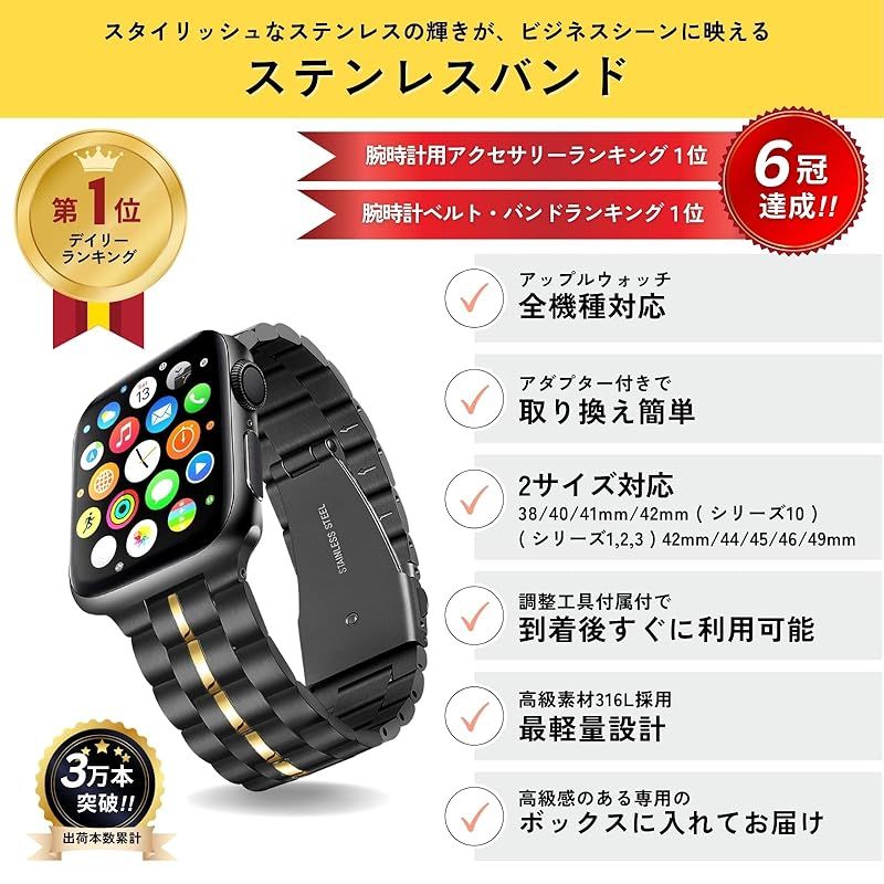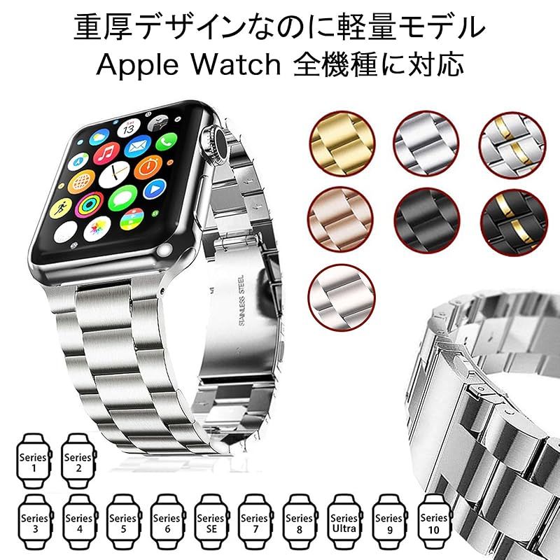 AriRi アップルウォッチ バンド ステンレスベルトはカジュアルになりすぎるラバーベルトやナイロンベルトではなく、重厚感とスタイリッシュな高級感をプラスしたアップルウォッチバンドになります。ステンレスバンドは少し重たく錆びるのが難点でしたが、AriRiのapplewatchbandは毎日着用してもストレスがなくなるように軽量化し、サビが付きにくい素材を使用することにより、その難点を改善しました。また、ステンレスバンドは腕周りの長さを調整しなければ、ブカブカになりコマをはずさなければいけませんが、調整工具を付属させることにより、商品到着後にすぐに着用できるようにしました。アップルウォッチの対応機種は、アップルウォッチ11 アップルウォッチ se アップルウォッチ ultra3 アップルウォッチ10 アップルウォッチ 9 アップルウォッチ 8 ウルトラ アップルウォッチ 7 アップルウォッチ6,アップルウォッチSE,アップルウォッチ5,4,3,2,1まで全機種に対応しており、対応サイズも38mm 40mm 41mm 42mm 44mm 45mm 46mm 49mmの全サイズ対応となります。※サイズの選び方は画像を確認お願い致します。アップルウォッチのステンレススチールバンドはラバーバンドやレザーバンドなど一緒で人気のアップルウォッチバンドです。ビジネスシーンや普段使いなど幅広いシーンで活躍してくれるapplewatchバンドになります。特に男性の方に人気がありメンズのアップルウォッチバンドといえば、レザーバンドかステンレススチールベルトと言われています。最近、スマートウォッチのアップルスマートウォッチ,スマートウォッチ ベルトのスマートウォッチ ベルトでは、ラバーバンドの素材がほとんどでしたが、ステンレススチールのバンドにすることにより、汗が目立たなかったり、汗を弾いてくれるのに、デザインがよいので、カジュアルになりすぎないデザインが人気の理由です。 AriRiアップルウォッチバンド ステンレススチールでは、オリジナルのボックスにステンレススチール専用の調整工具、アップルウォッチの画面やベルトを拭くクロスとセットでお送りさせて頂きます。